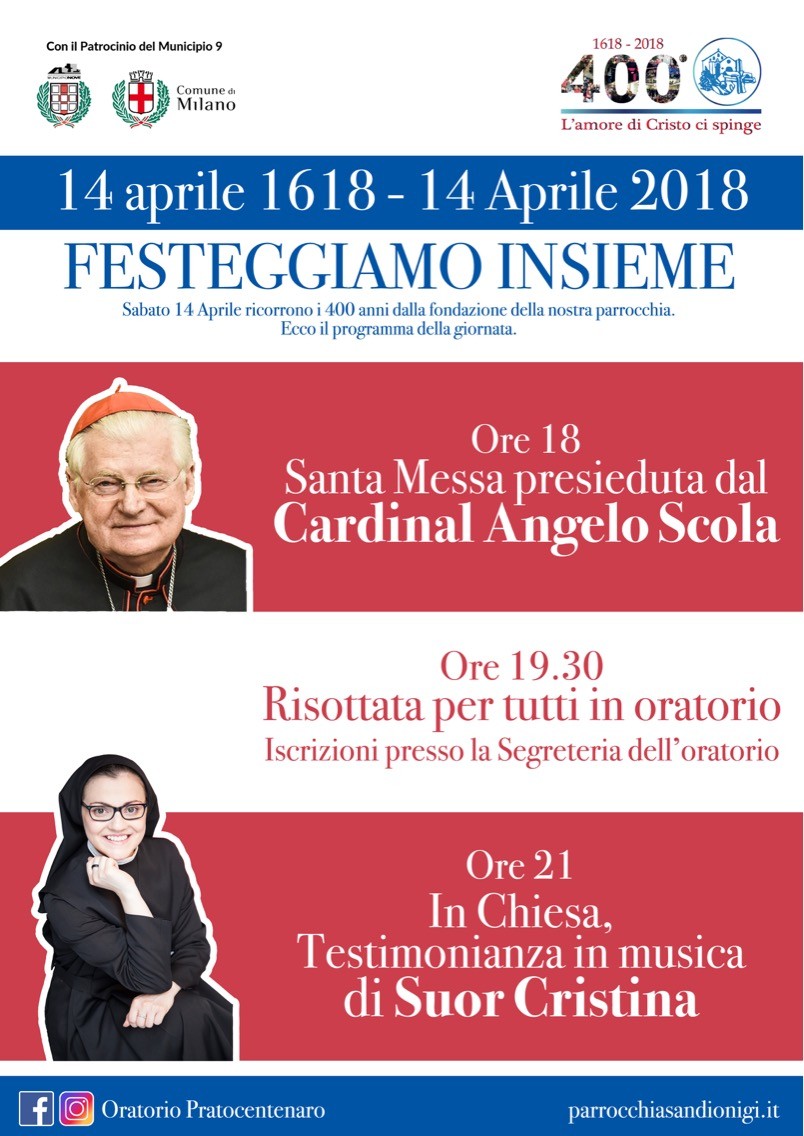 Il giorno 14 aprile 2018 si ricordano i 400 anni dalla data di fondazione della Parrocchia di San Dionigi in Ss. Clemente e Guido (14 aprile 1618): Ente Ecclesiastico che gestisce la nostra Scuola, ma soprattutto comunità cristiana che opera nel mondo ed accoglie da sempre persone, fragilità, esigenze per dare a tutti l’amorevole messaggio di Gesù Cristo: Dio è vicino all’uomo.