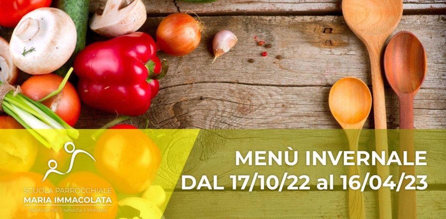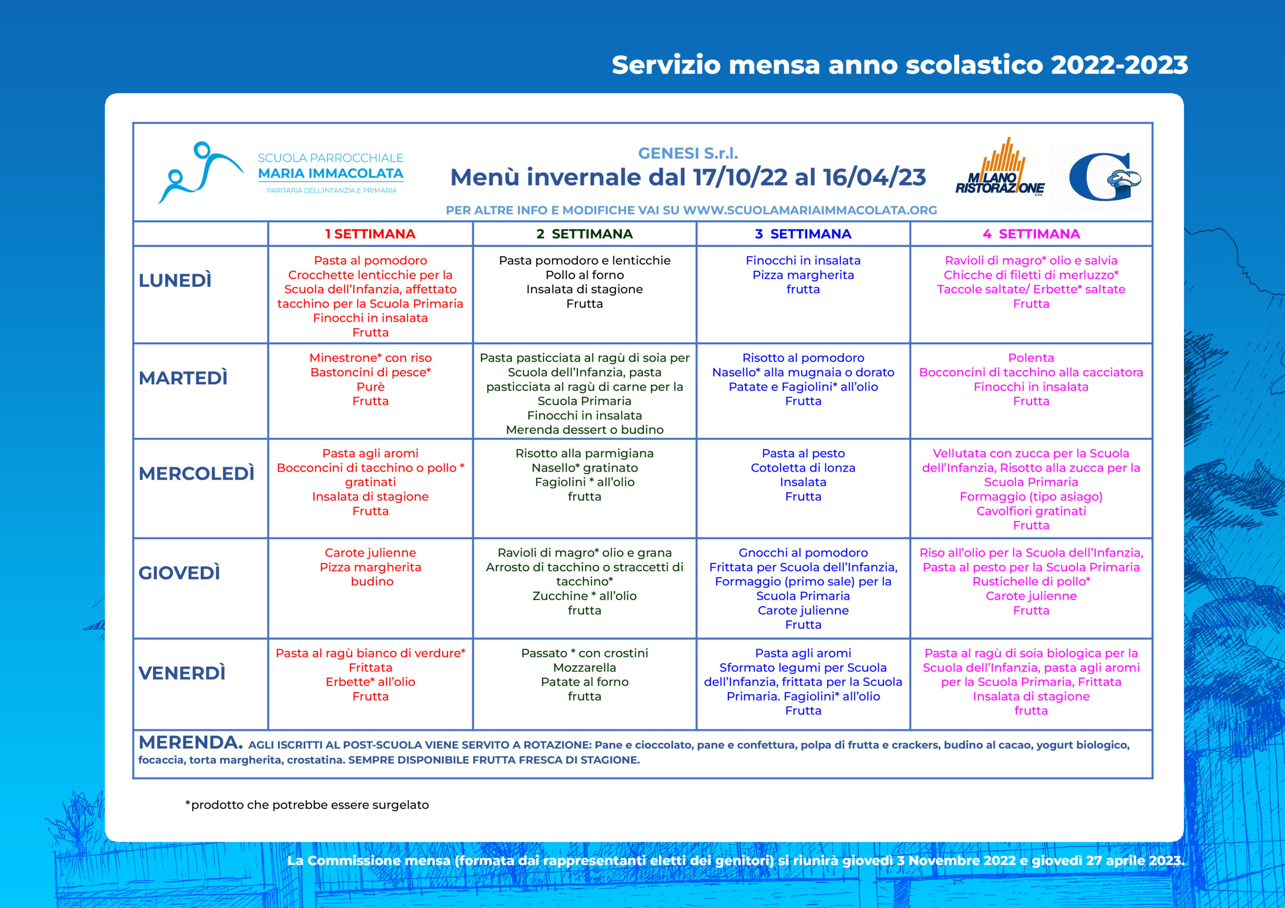 Ecco il menù invernale, in vigore da lunedì 17 ottobre 2022, per il servizio mensa gestito dal Gruppo Genesi Ristorazione. All'interno del menù sono riportate anche le proposte per la merenda.