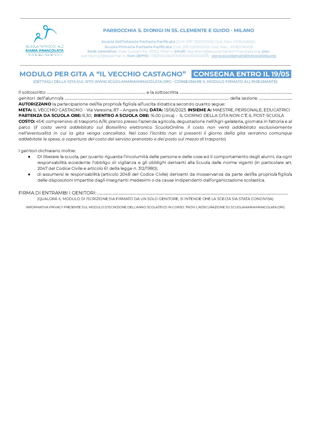 Per partecipare alla gita occorre portare il modulo di iscrizione (disponibile nelle aule o qui sul sito) che va riconsegnato firmato all'insegnante (non portarlo in segreteria). Chi si era iscritto alla gita con la data del 20 aprile NON DEVE riportare di nuovo il modulo. Chi si è iscritto e non potrà più partecipare dovrà comunicarlo via mail a segreteria@scuolamariaimmacolata.org. Chi non si era iscritto con la data del 20 aprile e oggi può partecipare dovrà stampare il modulo qui sul sito e consegnarlo alla maestra. La quota verrà poi addebitata sul borsellino elettronico.