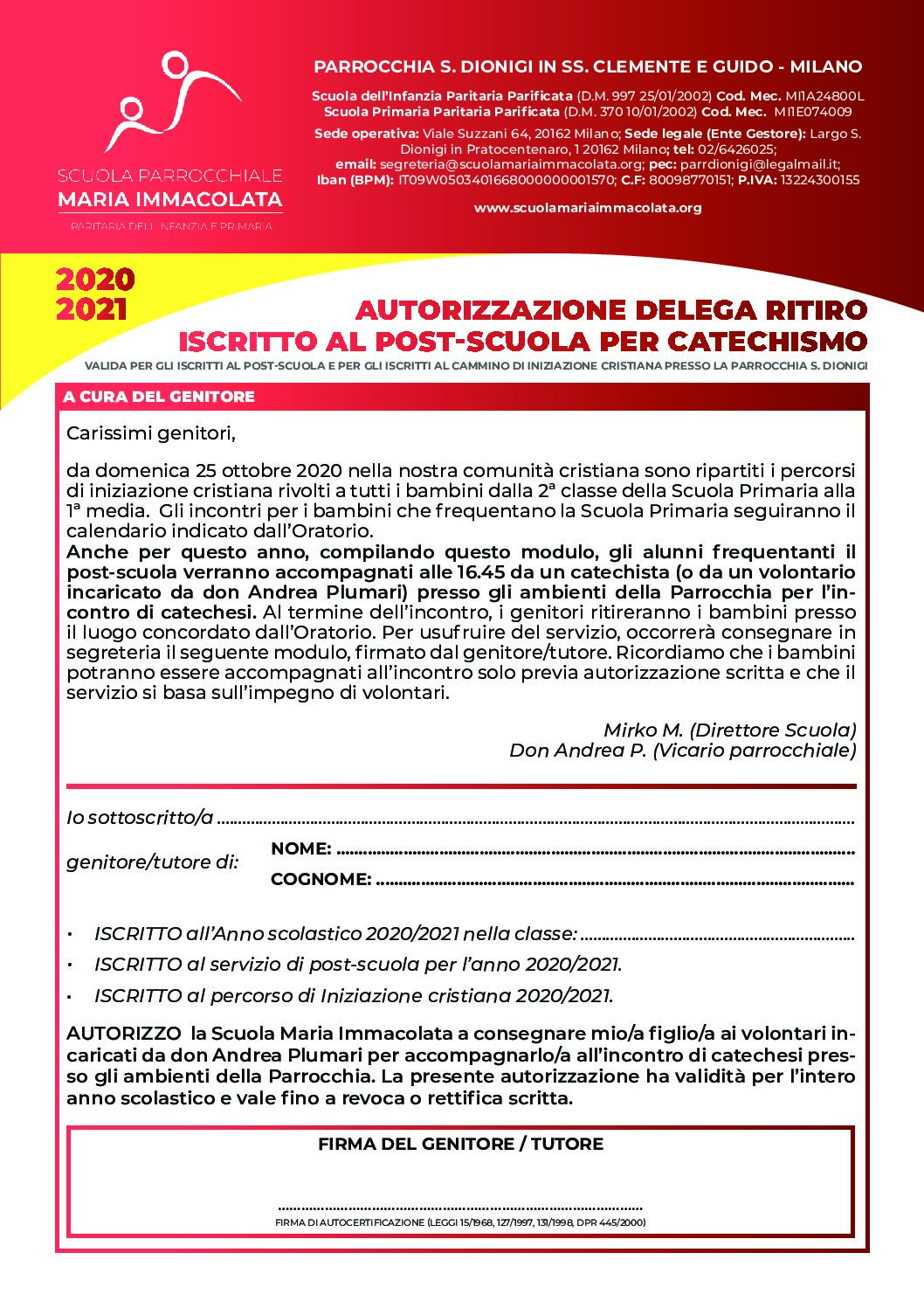 Anche per questo anno, compilando questo modulo, gli alunni frequentanti il post-scuola verranno accompagnati alle 16.45 da un catechista (o da un volontario incaricato da don Andrea Plumari) presso gli ambienti della Parrocchia per l’incontro di catechesi. Al termine dell’incontro, i genitori ritireranno i bambini presso il luogo concordato dall’Oratorio. Per usufruire del servizio, occorrerà consegnare in segreteria il seguente modulo, firmato dal genitore/tutore. Ricordiamo che i bambini potranno essere accompagnati all’incontro solo previa autorizzazione scritta e che il servizio si basa sull’impegno di volontari.