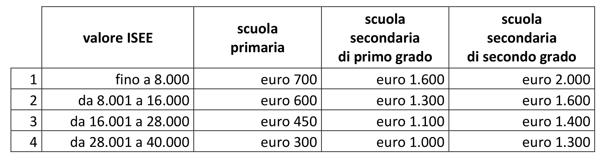 Il valore del contributo varia in relazione alla fascia ISEE di chi presenta richiesta e all’ordine e grado di scuola frequentata.