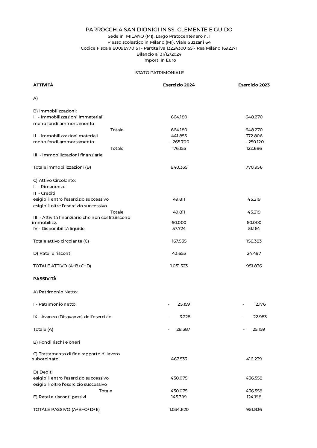 Voci del Patrimonio Netto: il disavanzo di gestione residuo nell'anno 2023 era di € 25.159 e sarà incrementato dal disavanzo di gestione 2024 di euro 3.228.