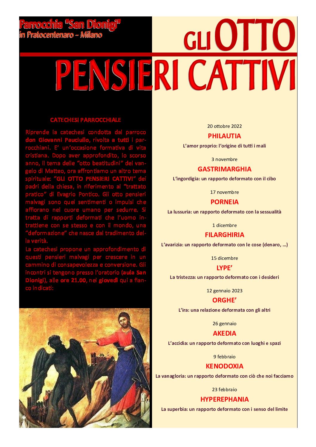 La catechesi propone un approfondimento di questi pensieri malvagi per crescere in un cammino di consapevolezza e conversione. Gli incontri si tengono presso l’oratorio (aula San Dionigi), alle ore 21.00, nei giovedì qui a fianco indicati.