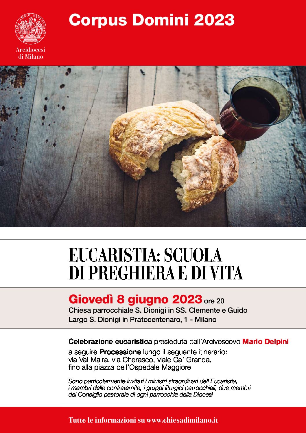 La solenne celebrazione diocesana del Corpus Domini, presieduta dall’Arcivescovo, monsignor Mario Delpini, si terrà giovedì 8 giugno, alle 20.00 nella nostra Parrocchia di San Dionigi in Santi Clemente e Guido. Alla celebrazione eucaristica farà seguito la Processione lungo il seguente itinerario: via Val Maira, via Cherasco, viale Ca’ Granda, fino alla piazza dell’Ospedale Maggiore.