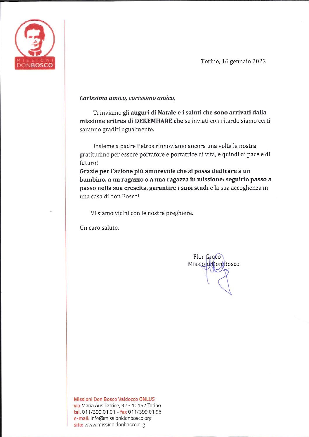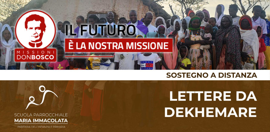 Dall’ottobre 2021, la nostra scuola ha scelto di sostenere la Missione salesiana di Dekemhare, in Eritrea. In particolare, attraverso le donazioni ricevute dalle famiglie, la scuola paga 3 borse di studio per il percorso scolastico di 3 bambini. L’impegno che è stato preso con “Missioni Don Bosco" è per almeno tre anni di sostegno a distanza, con uno stanziamento annuale di 1.080 euro.