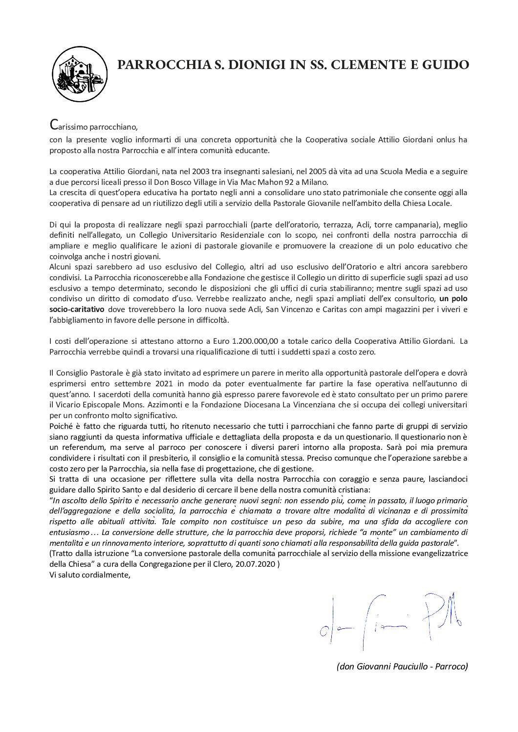 Il nostro Parroco desidera condividere con tutte le realtà della comunità cristiana di Pratocentenaro una fase di discernimento pastorale per l’ipotesi di creazione di un Collegio universitario negli spazi della nostra Parrocchia. La Cooperativa Attilio Giordani Onlus ha proposto la realizzazione, in alcuni spazi della Parrocchia (parte dell’oratorio, terrazza, Acli, torre campanaria), di un Collegio Universitario Residenziale con lo scopo di ampliare e meglio qualificare le azioni di pastorale giovanile e promuovere la creazione di un polo educativo (Scuola + Oratorio + Collegio) al servizio del quartiere e della città. Verrebbe realizzato anche, negli spazi ampliati dell’ex consultorio (largo S. Dionigi in Pratocentenaro) un polo socio-caritativo, dove troverebbero la loro nuova sede le Acli, la Conferenza San Vincenzo e la Caritas, con ampi magazzini per i viveri e l’abbigliamento in favore delle persone in difficoltà. Si tratterebbe di una riqualificazione complessiva, il cui costo totale sarebbe a carico della Cooperativa Attilio Giordani.