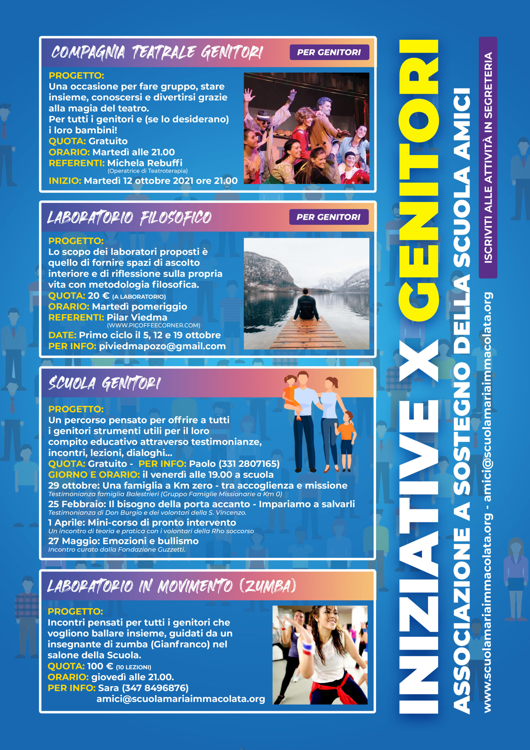 - Da martedì 12 ottobre: Compagnia teatrale dei genitori della scuola. Referente: Michela Rebuffi. Il martedì alle 21.00 nel salone della scuola. L’attività non richiede alcun costo. In segreteria trovi il modulo di iscrizione (O SCARICALO QUI) per partecipare. Si tratta di una proposta pensata in particolare per tutti i genitori della scuola come occasione per stare insieme, fare gruppo e vivere l’amicizia da papà e mamme che amano la scuola e il suo Progetto Educativo. Ne vedrete delle belle!