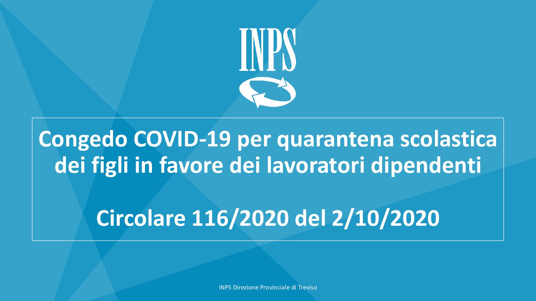L’articolo 5 del decreto-legge 8 settembre 2020, n.111, recante “Disposizioni urgenti per far fronte a indifferibili esigenze finanziarie e di sostegno per l’avvio dell’anno scolastico, connesse all’emergenza epidemiologica da COVID-19”, ha introdotto, a favore dei genitori lavoratori dipendenti, un congedo indennizzato (c.d. congedo COVID-19 per quarantena scolastica dei figli) da utilizzare per astenersi dal lavoro, in tutto o in parte, in corrispondenza del periodo di quarantena del figlio convivente e minore di anni quattordici, disposta dal Dipartimento di prevenzione della ASL territorialmente competente a seguito di contatto verificatosi all’interno del plesso scolastico.