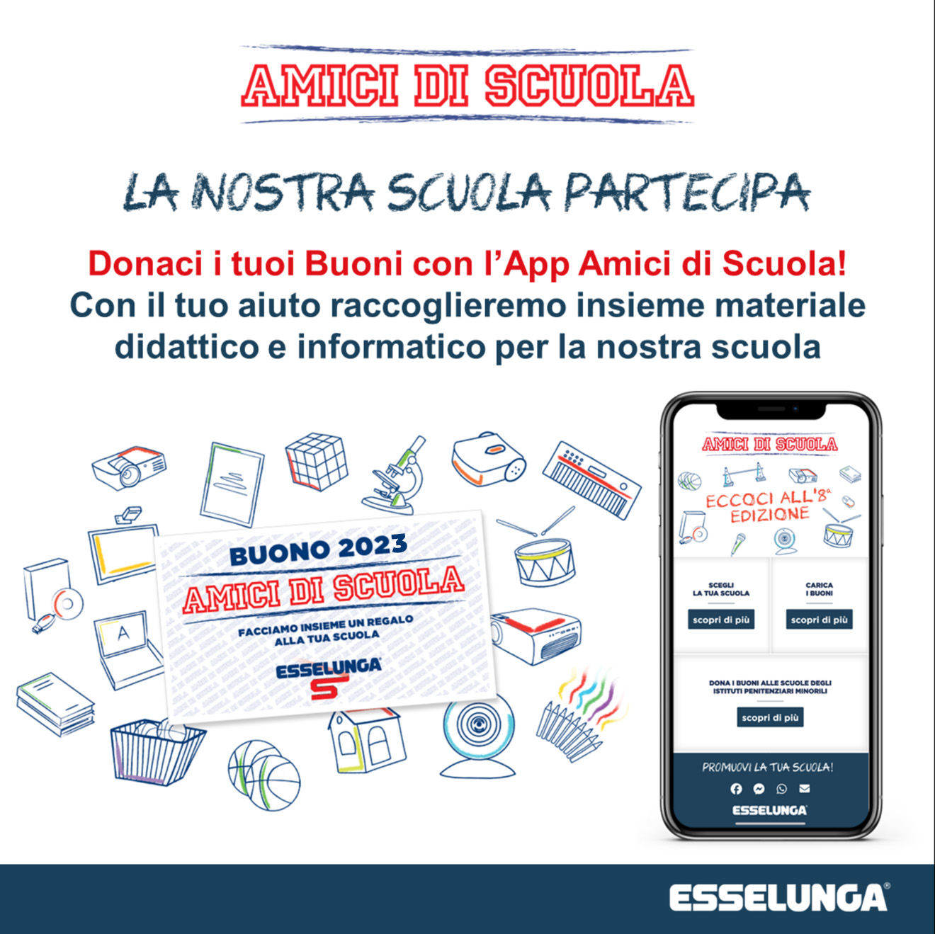 Riparte l'iniziativa di Esselunga a favore delle scuole. Ogni 25 euro di spesa, sarà possibile richiedere alla cassa un buono “Amici di scuola", da consegnare poi nell'apposito contenitore all'ingresso della scuola.