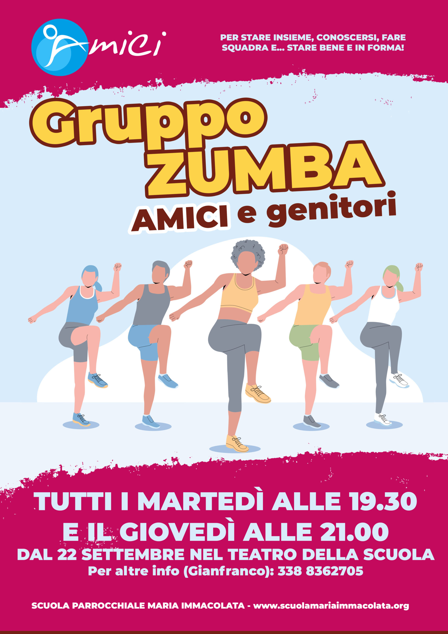 Dopo il bel successo dello scorso anno, riparte il gruppo “Zumba" promosso dall’Associazione a sostegno della scuola AMICI. Un gruppo pensato per mamme, papà, genitori e sostenitori della scuola, guidato da Gianfranco, istruttore da tanti anni di zumba.
