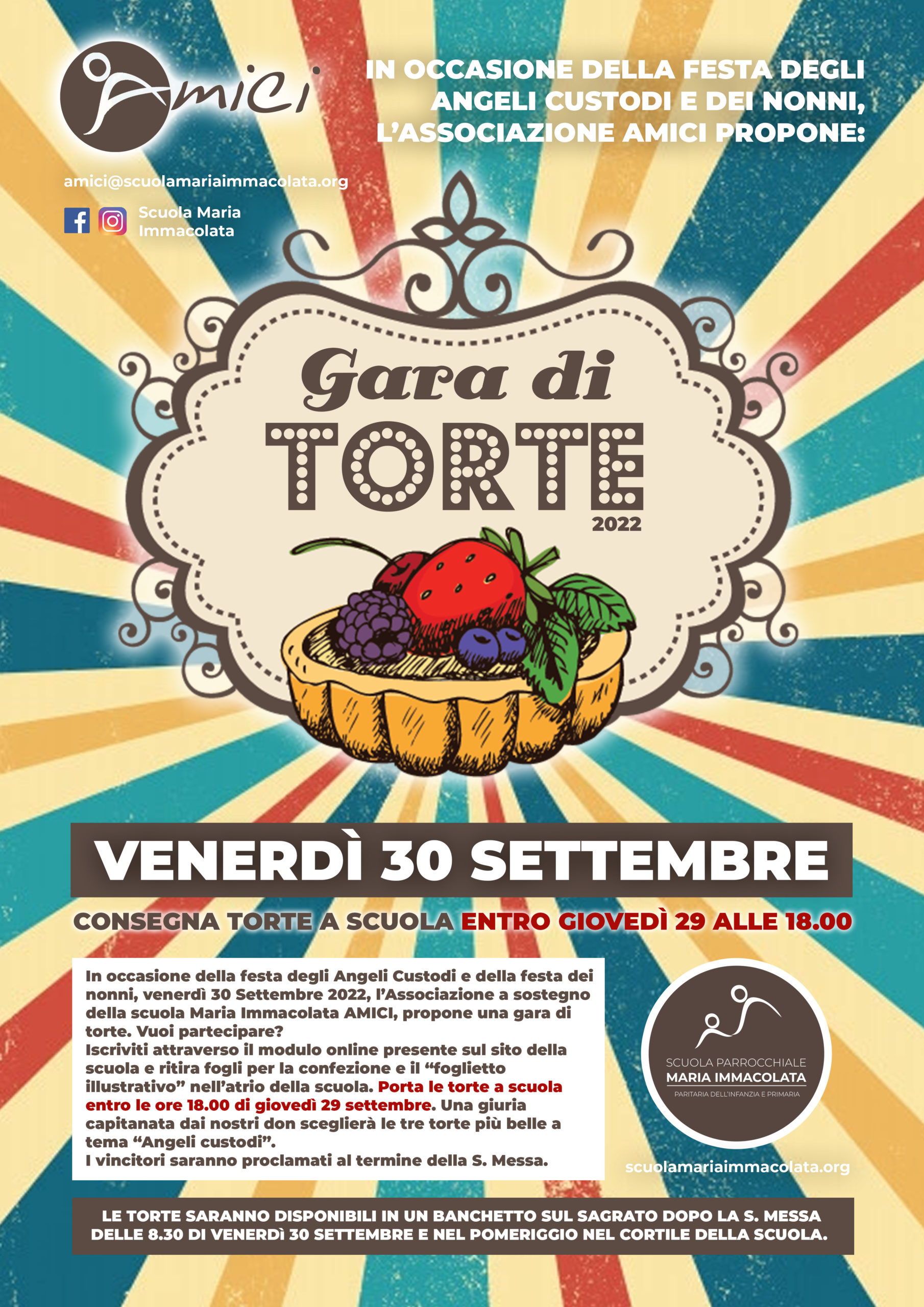 In occasione della festa degli Angeli Custodi e della festa dei nonni, sabato 30 settembre 2022, l’Associazione a sostegno della scuola Maria Immacolata AMICI, propone una gara di torte.