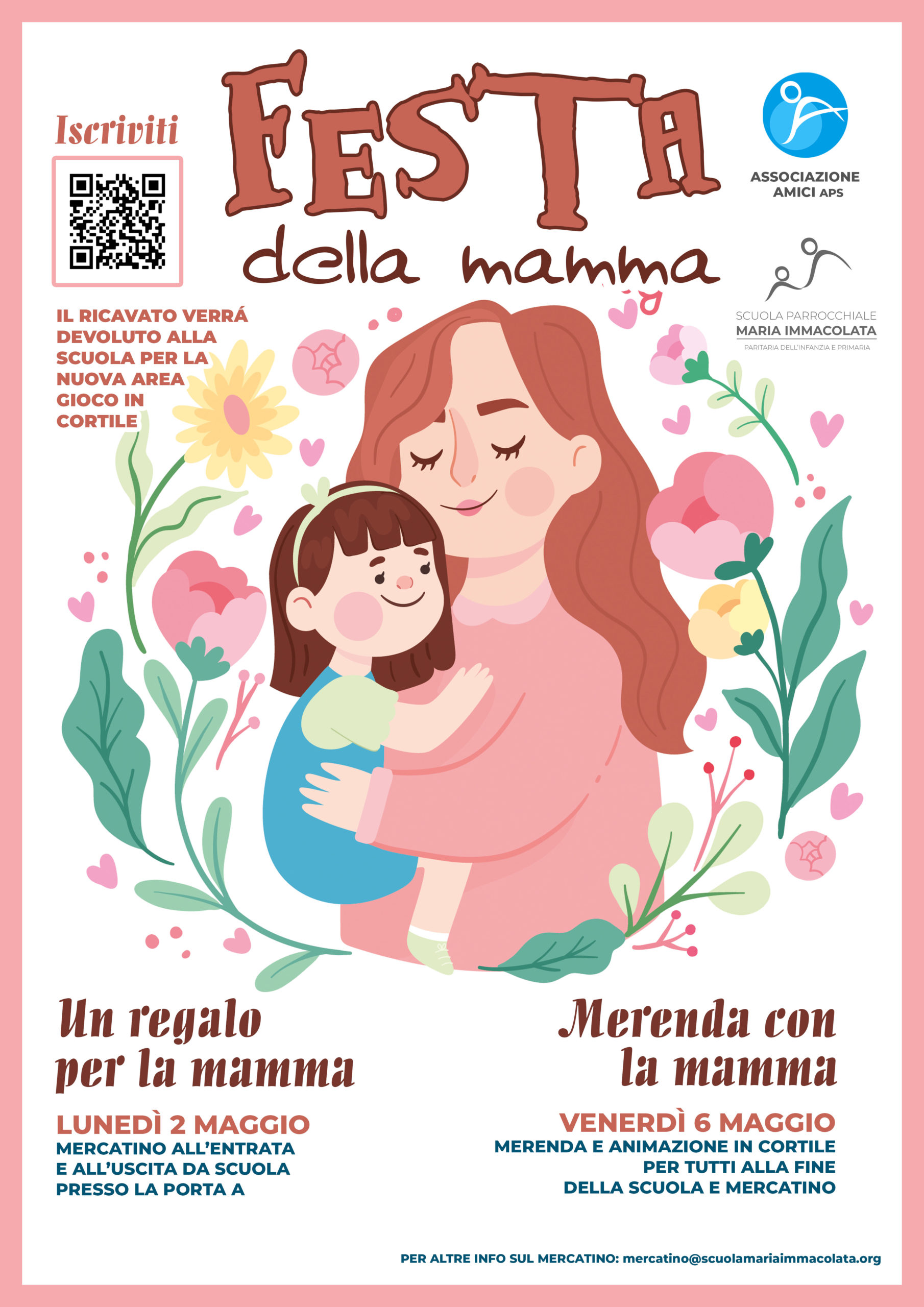 Il mercatino per la festa della mamma, in programma lunedì 2 maggio presso la porta A negli orari di ingresso e di uscita dei bambini dalla scuola. Sarà presente uno stand con i volontari dell’associazione e alcuni gadget realizzati a mano da regalare a tutte le mamme. Per info e prenotazioni scrivere a mercatino@scuolamariaimmacolata.org. Le offerte raccolte dal mercatino saranno devolute alla scuola per il pagamento della nuova area giochi della scuola.