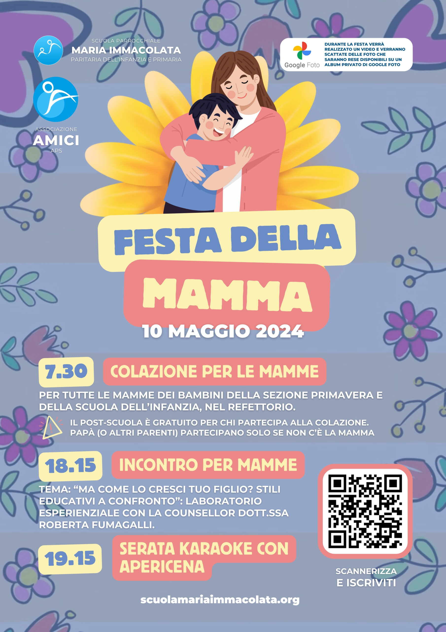 Alle 7.30: Colazione per le mamme dei bambini iscritti alla Sezione Primavera e alla Scuola dell’Infanzia nel refettorio. Il pre-scuola, per i bambini che vengono a scuola con i genitori per la colazione (come anticipato nel calendario scolastico) è libero. Le maestre e tutto il personale della scuola vi aspettano nel refettorio nuovo (seminterrato) per un momento di gioia e di condivisione. Questo momento è pensato per le mamme: i papà o altri parenti vi partecipano solo se la mamma non può esserci.
