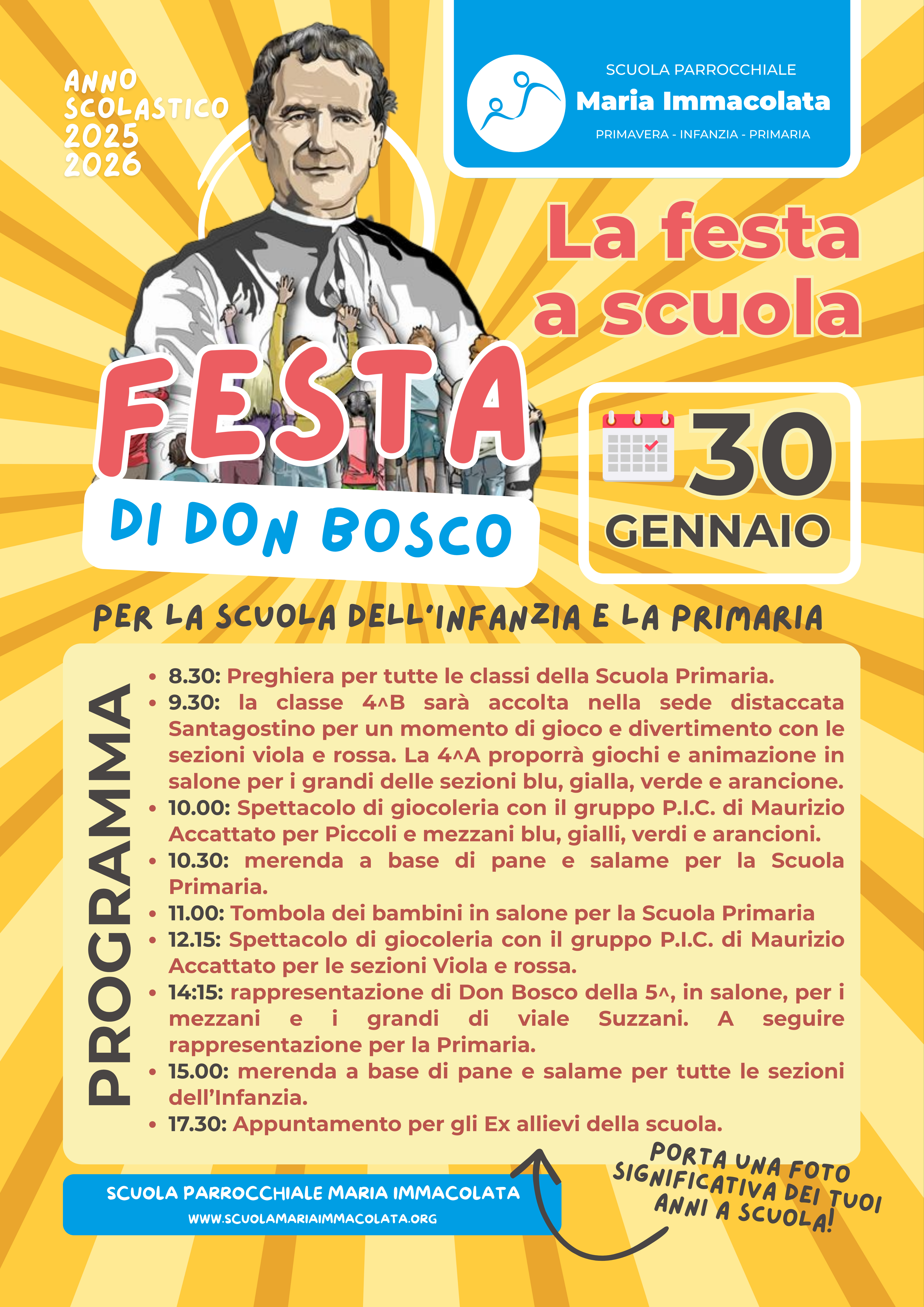 - 17.30: Appuntamento per gli Ex allievi della scuola. Hai una foto significativa dei tuoi anni alla “Maria Immacolata"? Portala a scuola.