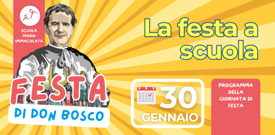 Venerdì 30 gennaio, come previsto dal calendario scolastico, festeggeremo il punto di riferimento del Progetto Educativo della nostra scuola: don Bosco. Il suo esempio, la sua vita, i suoi insegnamenti hanno guidato i tanti anni di gestione della nostra scuola delle Figlie di Maria Ausiliatrice e ancora oggi ci invitano a costruire una scuola sempre più aderente al pensiero di questo santo sacerdote, vissuto nell’800 a Torino. La giornata di festa coinvolgerà tutte le fasce di età e prevede momenti di divertimento e gioia. Ci sarà la tradizionale rappresentazione sulla vita di don Bosco a cura della classe quinta, gli spettacoli del “Pronto intervento clown" di Maurizio Accattato, la tombola dei ragazzi (ce ne sarà poi una pensata per tutte le famiglie domenica a scuola… non dimenticate di ritirare la cartella in portineria o di chiederla all’indirizzo amici@scuolamariaimmacolata.org) e l’immancabile merenda a base di pane e salame (tranne per la primavera, che gusterà dei biscotti).