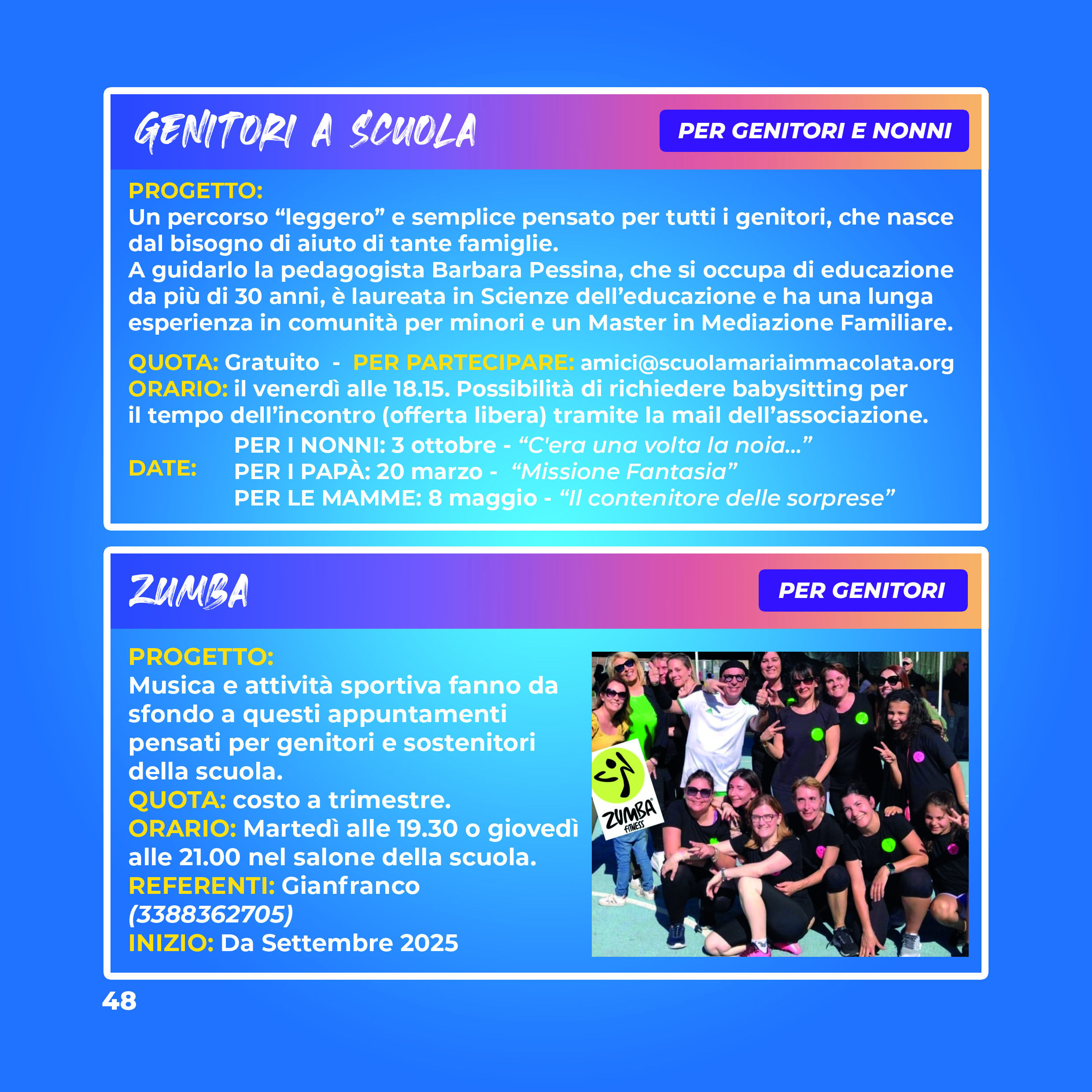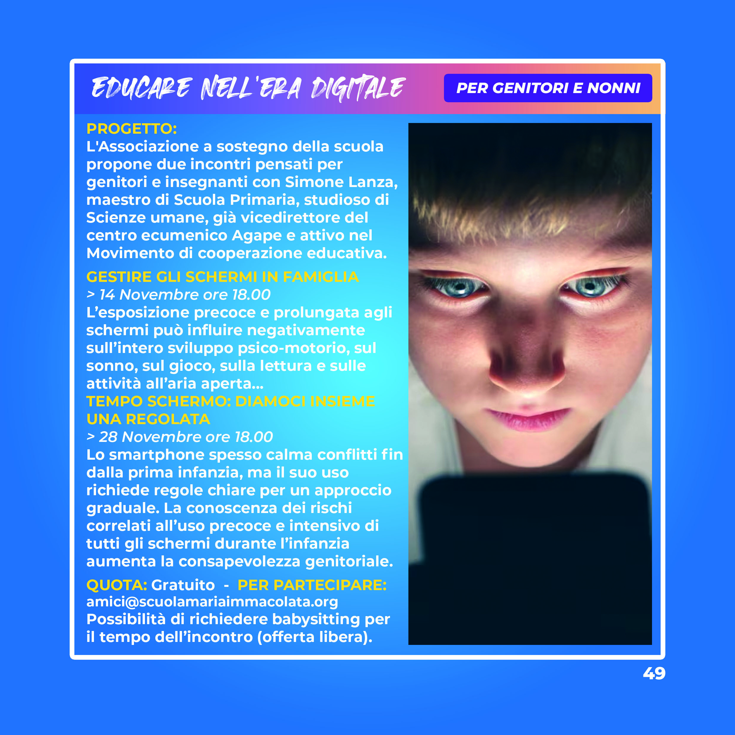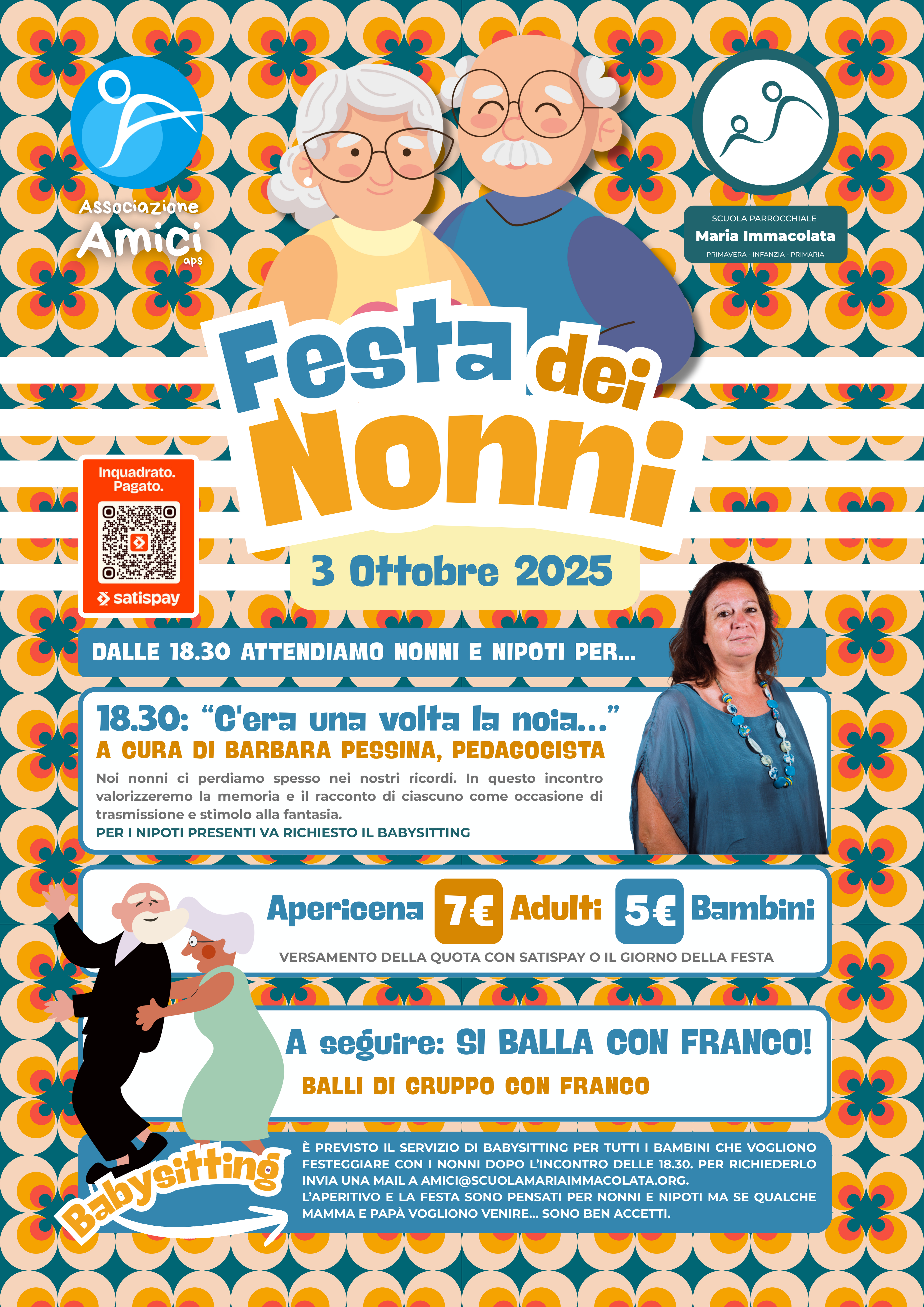 Aspettiamo nel salone della scuola tutti i nonni e – per chi lo desidera – i loro nipoti. I nonni vivranno un momento formativo con un laboratorio a cura della pedagogista Barbara Pessina. I bambini invece saranno accompagnati nelle aule per un momento di gioco. Chiediamo di segnalarci la presenza dei bambini per il servizio di babysitting all'indirizzo amici@scuolamariaimmacolata.org. Se qualche genitore vuole aiutare o vuole stare con i propri bimbi può farlo. Chi lo desidera potrà lasciare una offerta per il babysitting che servirà a pagare le educatrici.