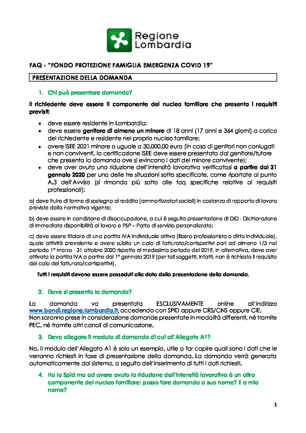 L’obiettivo dell’intervento di Regione Lombardia è il sostegno alle famiglie con figli minori in situazione di particolare criticità a seguito dell’emergenza COVID-19. In particolare, si prevede l’erogazione di contributi in denaro al fine di compensare l’impatto economico derivante dall’emergenza sanitaria sul reddito familiare, ad integrazione delle misure ordinarie ed emergenziali di sostegno al reddito adottate a livello nazionale.