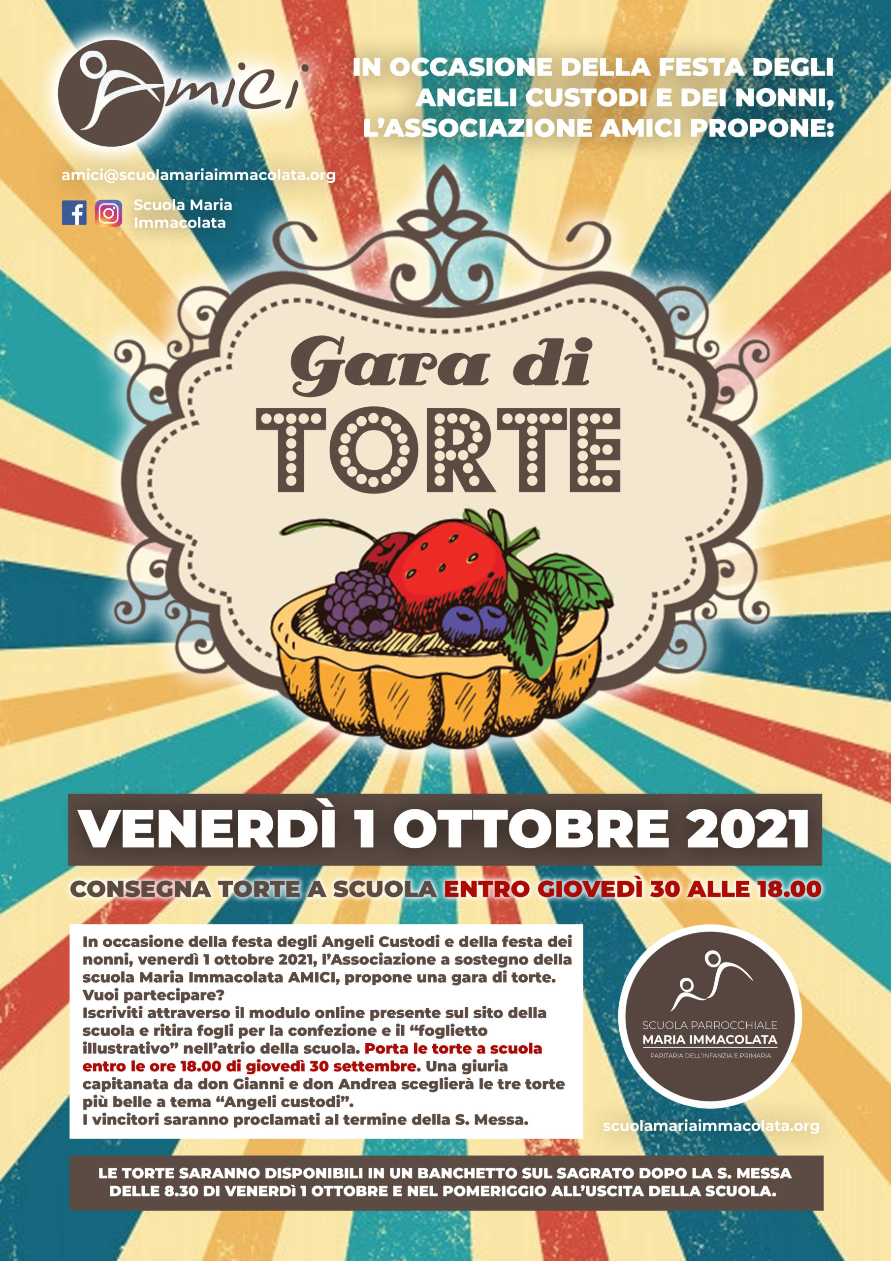 In occasione della festa degli Angeli Custodi e della festa dei nonni, venerdì 1 ottobre 2021, l’Associazione a sostegno della scuola Maria Immacolata AMICI, propone una gara di torte.
