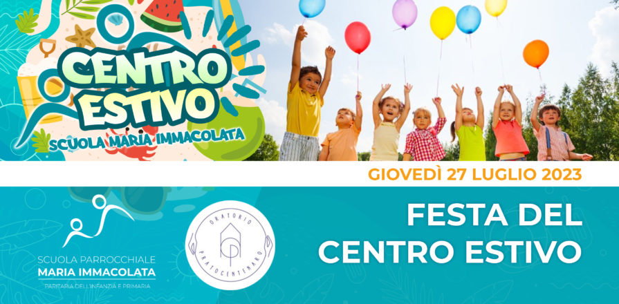 Giunti alla quarta settimana di Centro Estivo… è tempo di far festa! Tutti i bambini iscritti al Centro Estivo della Scuola dell’Infanzia e della Scuola Primaria e Secondaria di primo grado, sono invitati a partecipare, con le loro famiglie, alla Festa del Centro Estivo 2023, in programma per giovedì 27 luglio. Questo il programma: