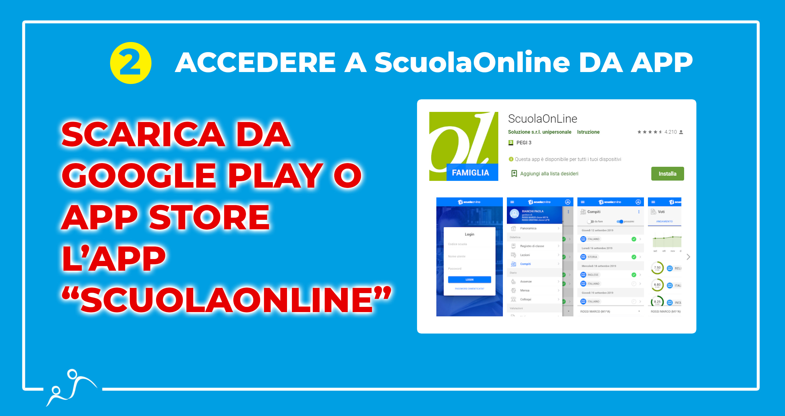 Il registro sarà consultabile online (QUI o dalla home page del sito della scuola, dove vedete il link “Scuola online: vai al portale della Scuola Maria Immacolata”) o tramite app scaricabile gratuitamente da Google Play (Qui il link per scaricarlo: potete già farlo se lo desiderate, anche se sarà possibile accedere solo quando vi comunicheremo i dati di accesso) o su App Store (Qui per scaricarlo).