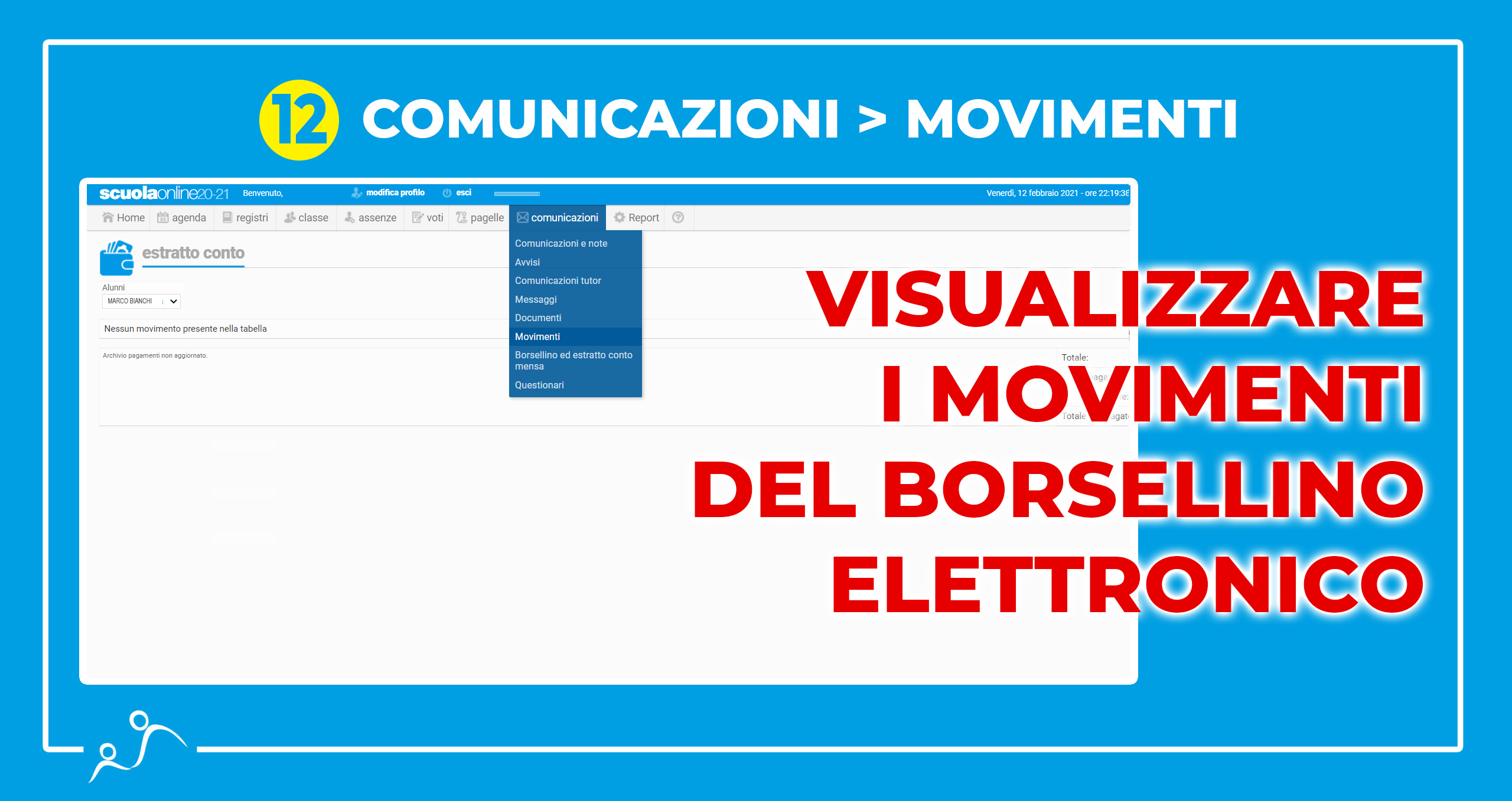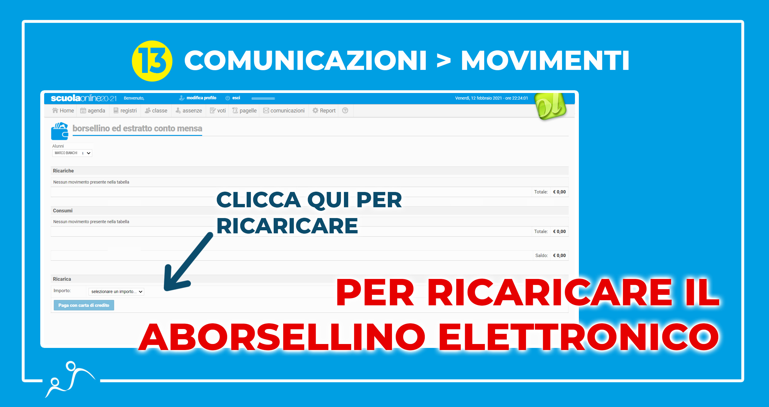 - L’attivazione del borsellino elettronico (sezione comunicazioni > borsellino ed estratto conto mensa). Su questo versante in molti troveranno il borsellino già in negativo in quanto sono stati addebitati i costi di alcuni servizi (gite, abbigliamento, foto, post-scuola giornaliero ecc). Sarà quindi necessario ricaricare il borsellino tramite carta di credito (selezionando gli importi disponibili). Se sprovvisti di carta di credito occorrerà effettuare un bonifico alla scuola specificando nella causale “RICARICA BORSELLINO ELETTRONICO COGNOME NOME”. Gli importi eventualmente avanzati a fine anno saranno conservati fino al termine del ciclo scolastico.