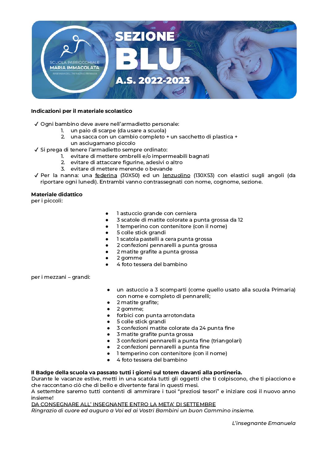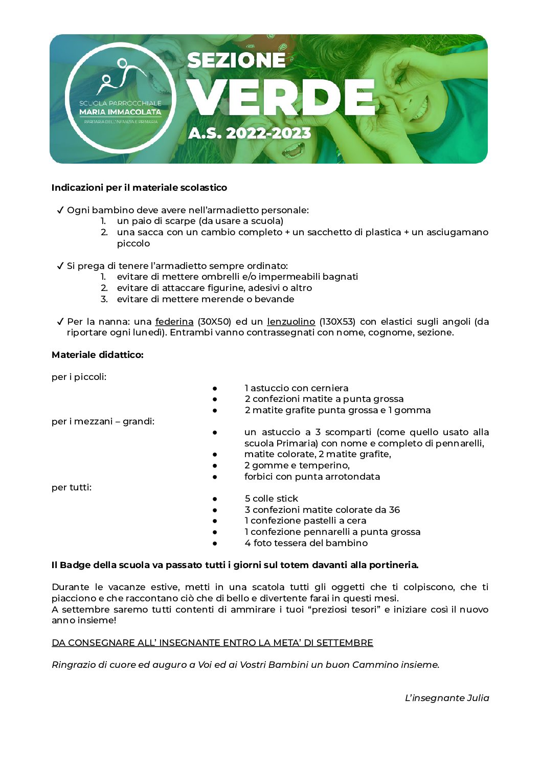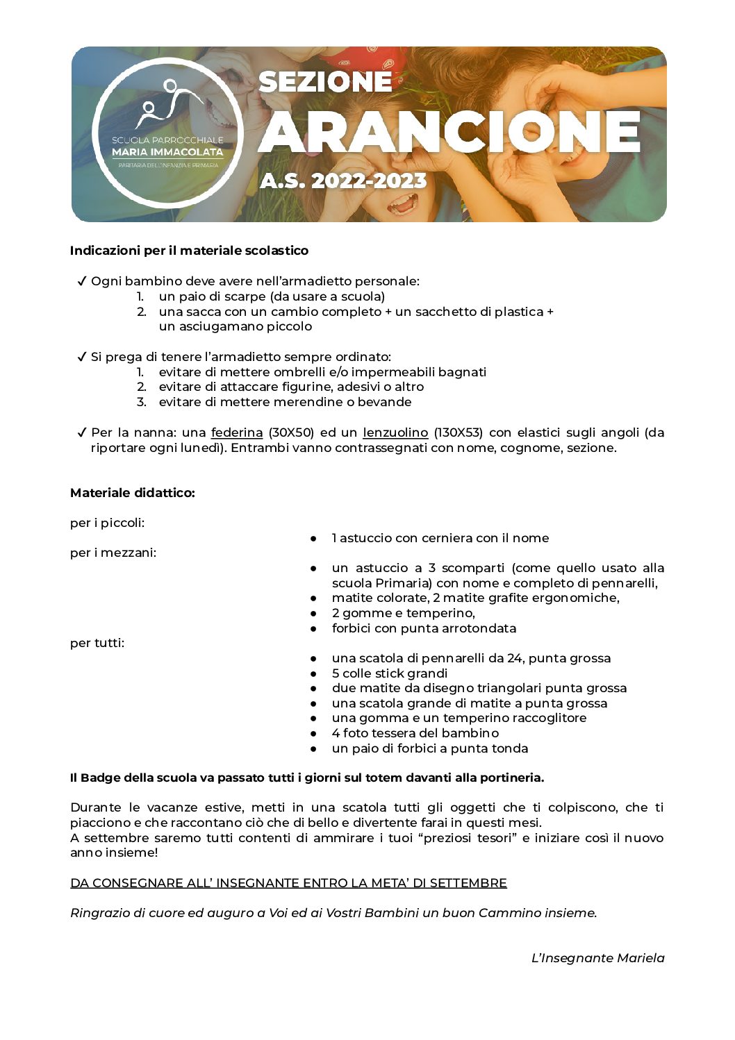 In vista del prossimo anno scolastico 2022-2023, le insegnanti della Scuola dell'Infanzia chiedono a tutti i genitori di recuperare il materiale necessario per le attività e i laboratori a scuola. Trovate la lettera della propria insegnante nei riquadri qui sotto.
