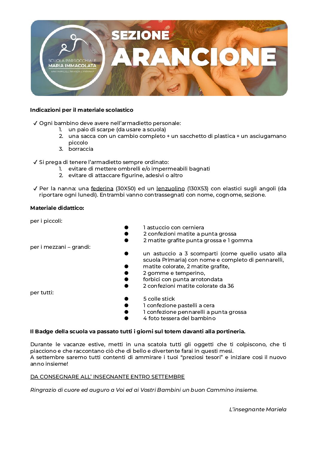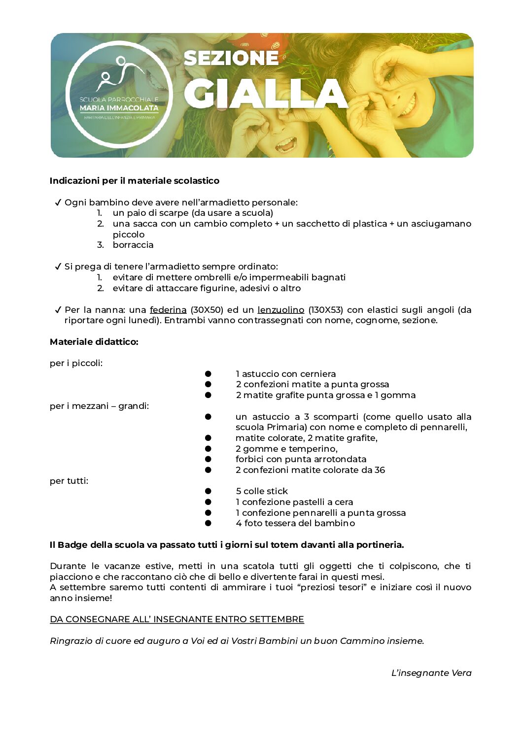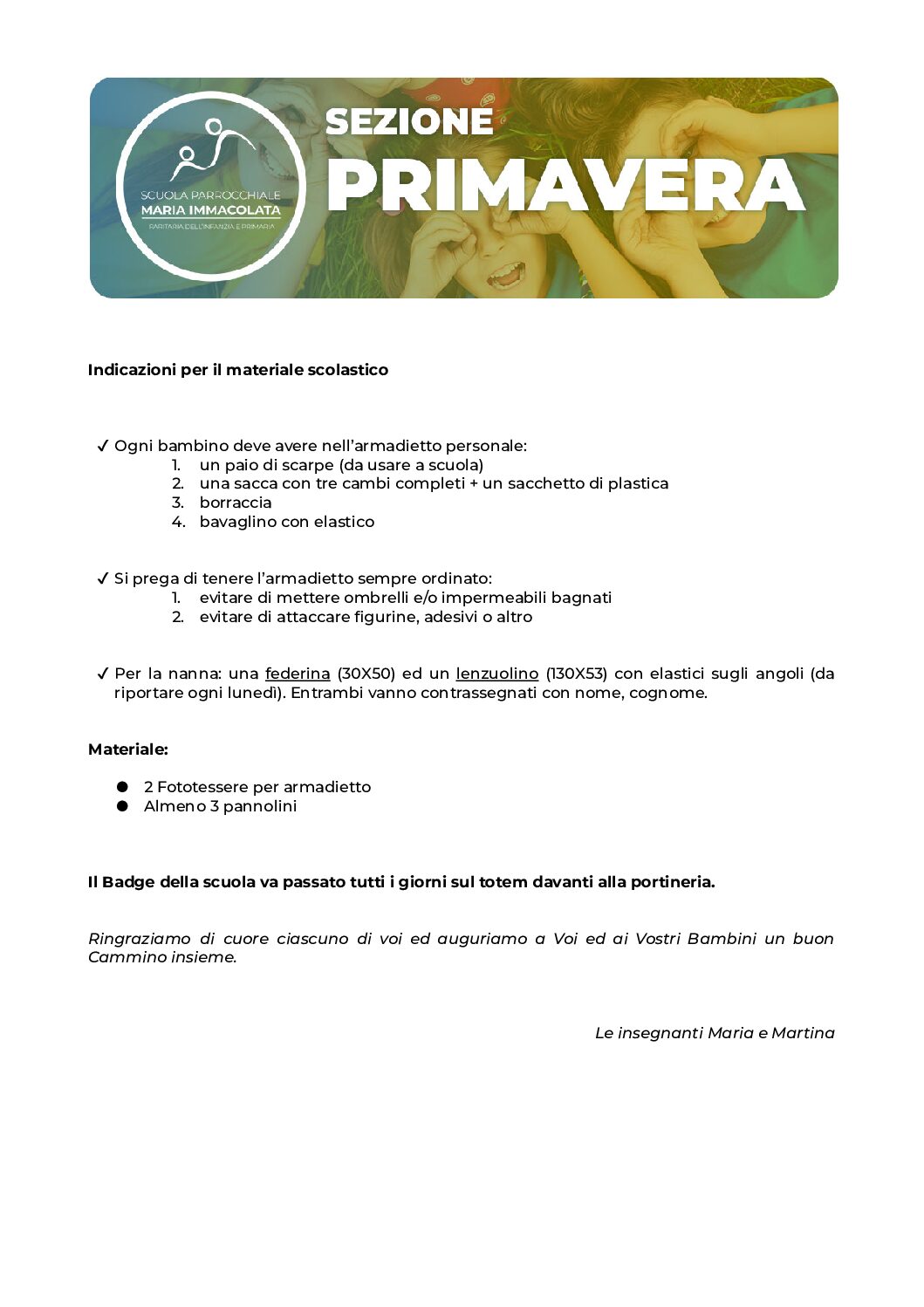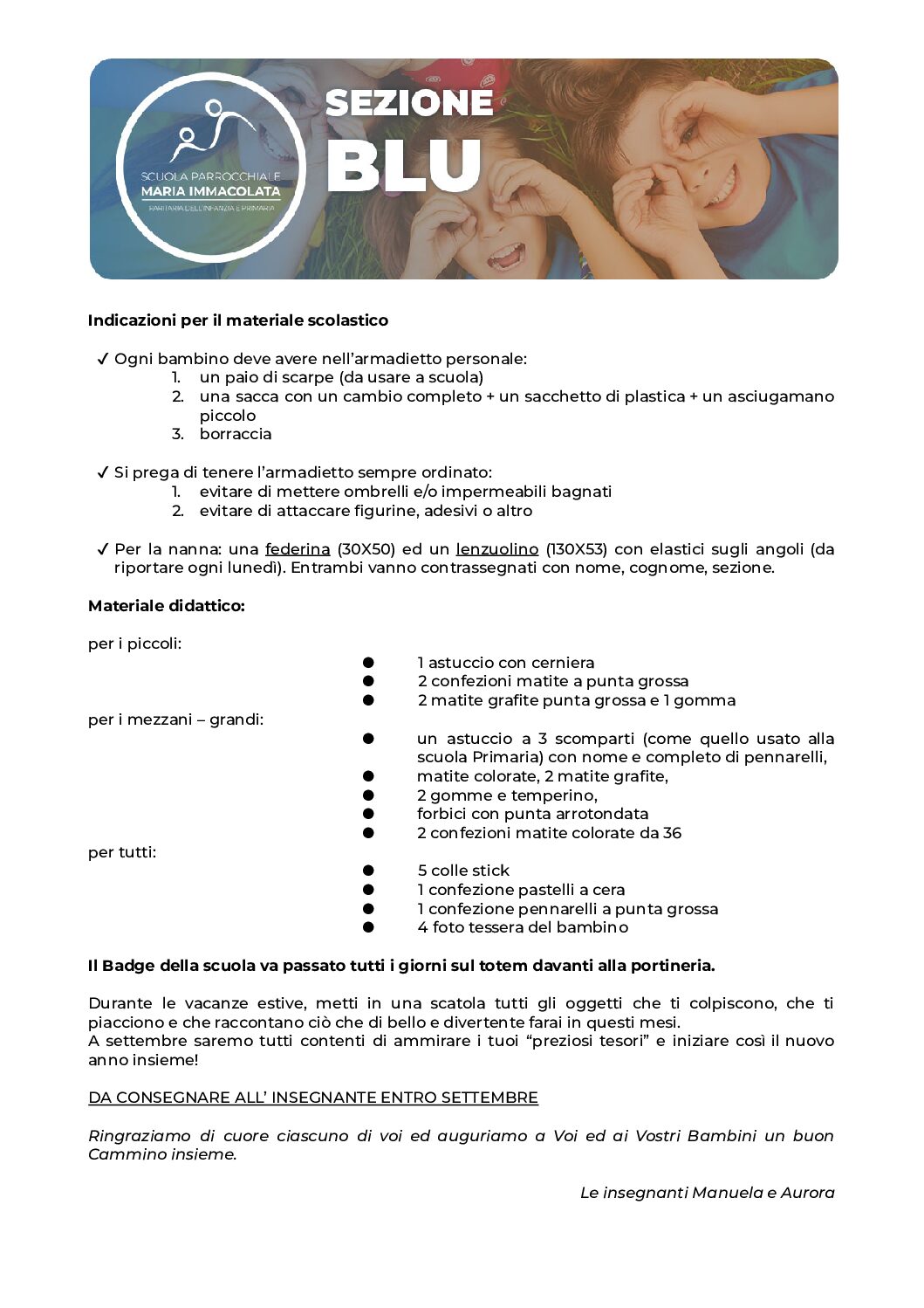 In vista del prossimo anno scolastico 2024-2025, le insegnanti della Scuola dell’Infanzia e le educatrici della Sezione Primavera chiedono a tutti i genitori di recuperare il materiale necessario per le attività e i laboratori a scuola. Trovate la lettera della propria insegnante nei riquadri qui sotto.