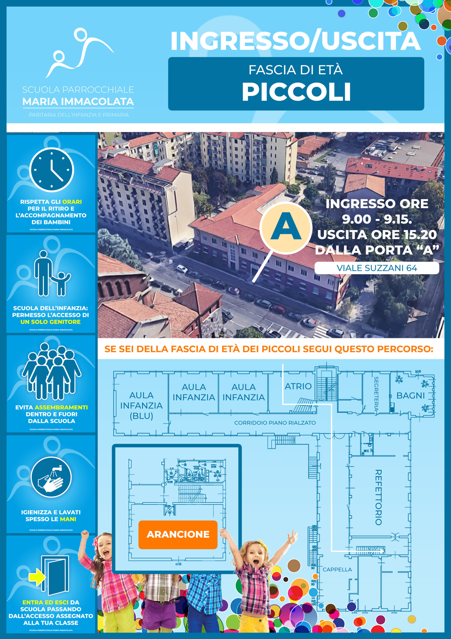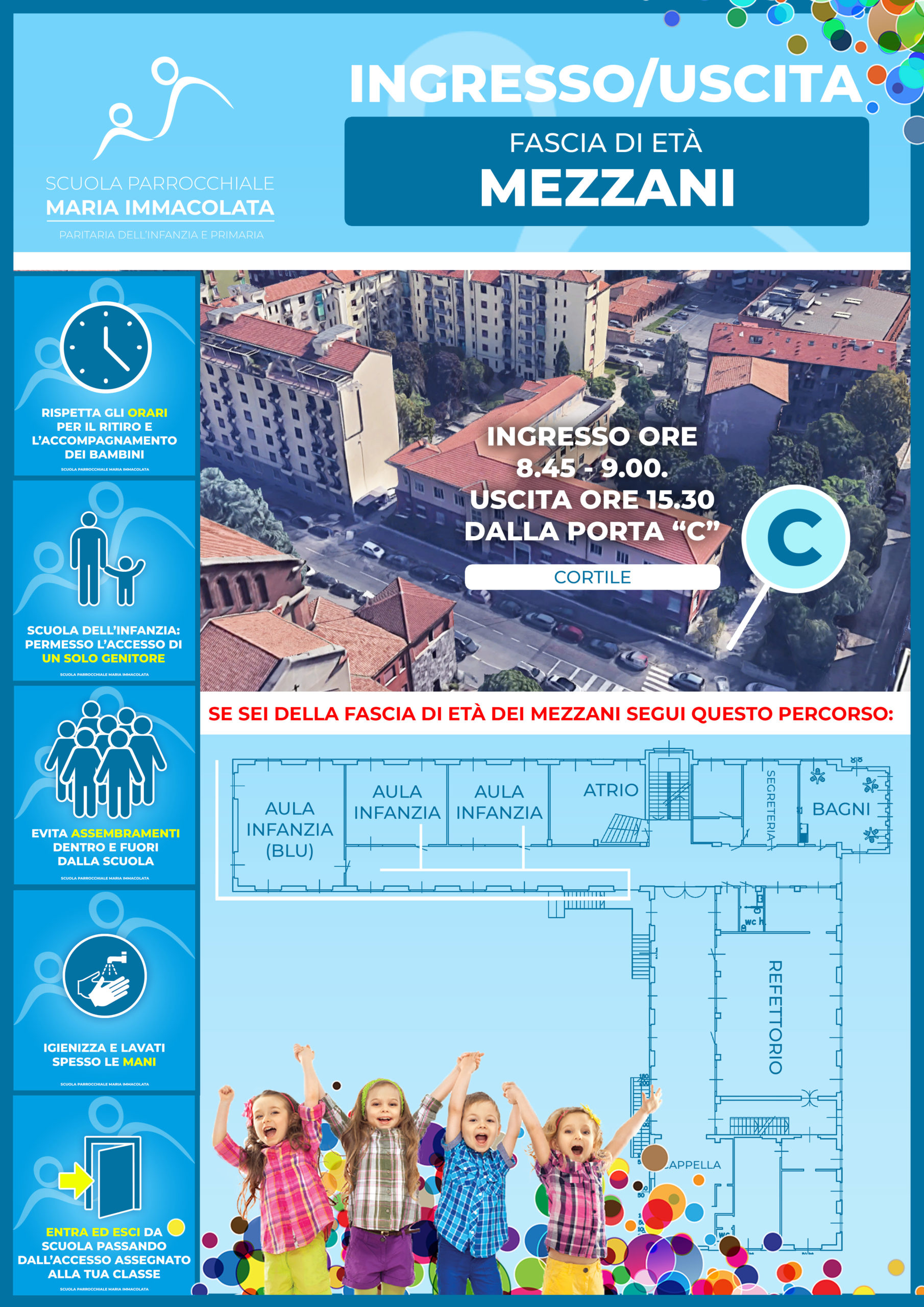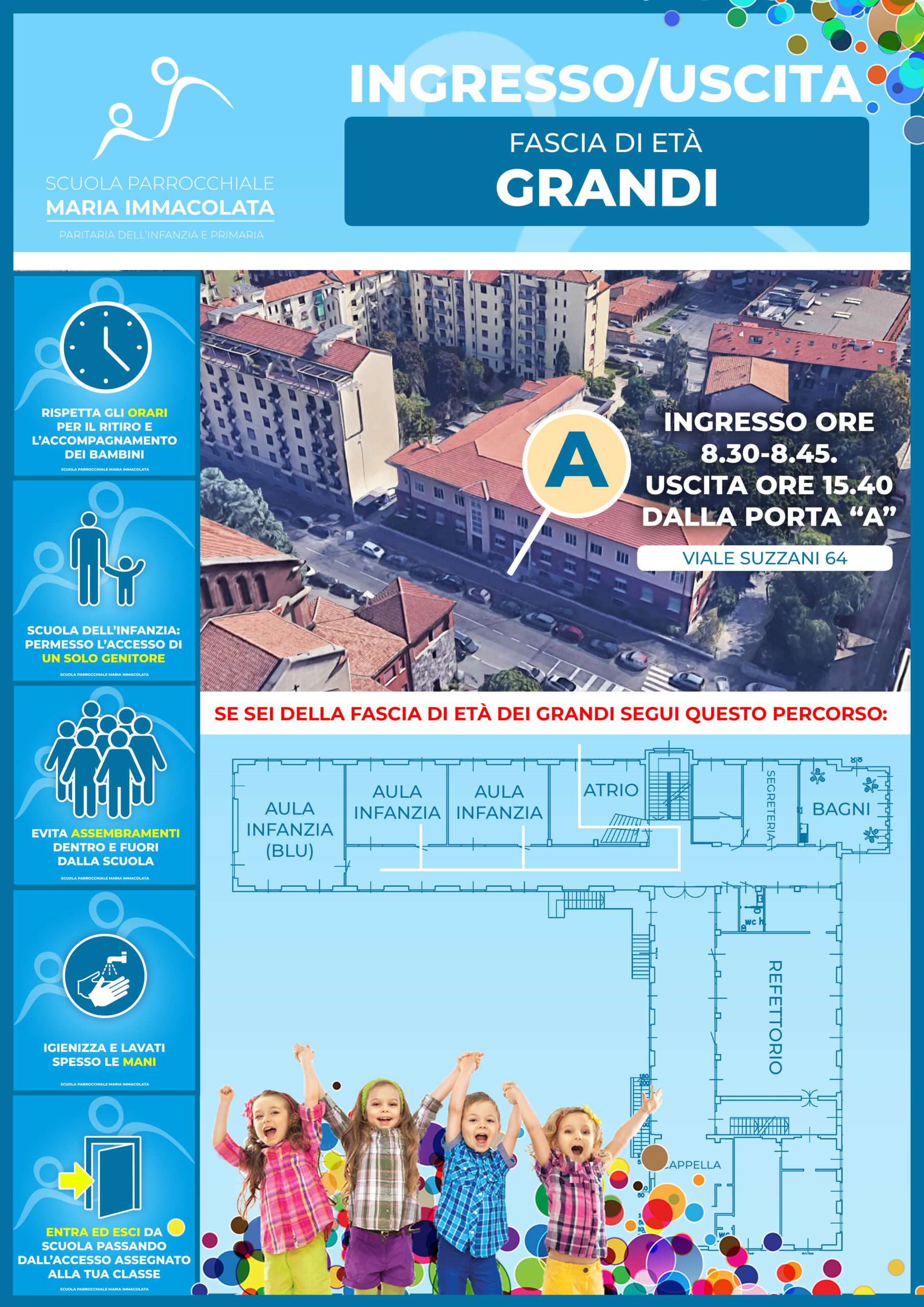 Per l’Anno scolastico 2020-2021 sono previsti orari di ingresso e uscita scaglionati per le diverse sezioni, in modo da evitare assembramenti nei corridoi. Gli orari di ingresso/uscita devono essere rispettati scrupolosamente. Piccoli e Grandi utilizzeranno sempre l’atrio principale (PORTA A), i mezzani invece entreranno ed usciranno dal cortile della scuola (PORTA C).