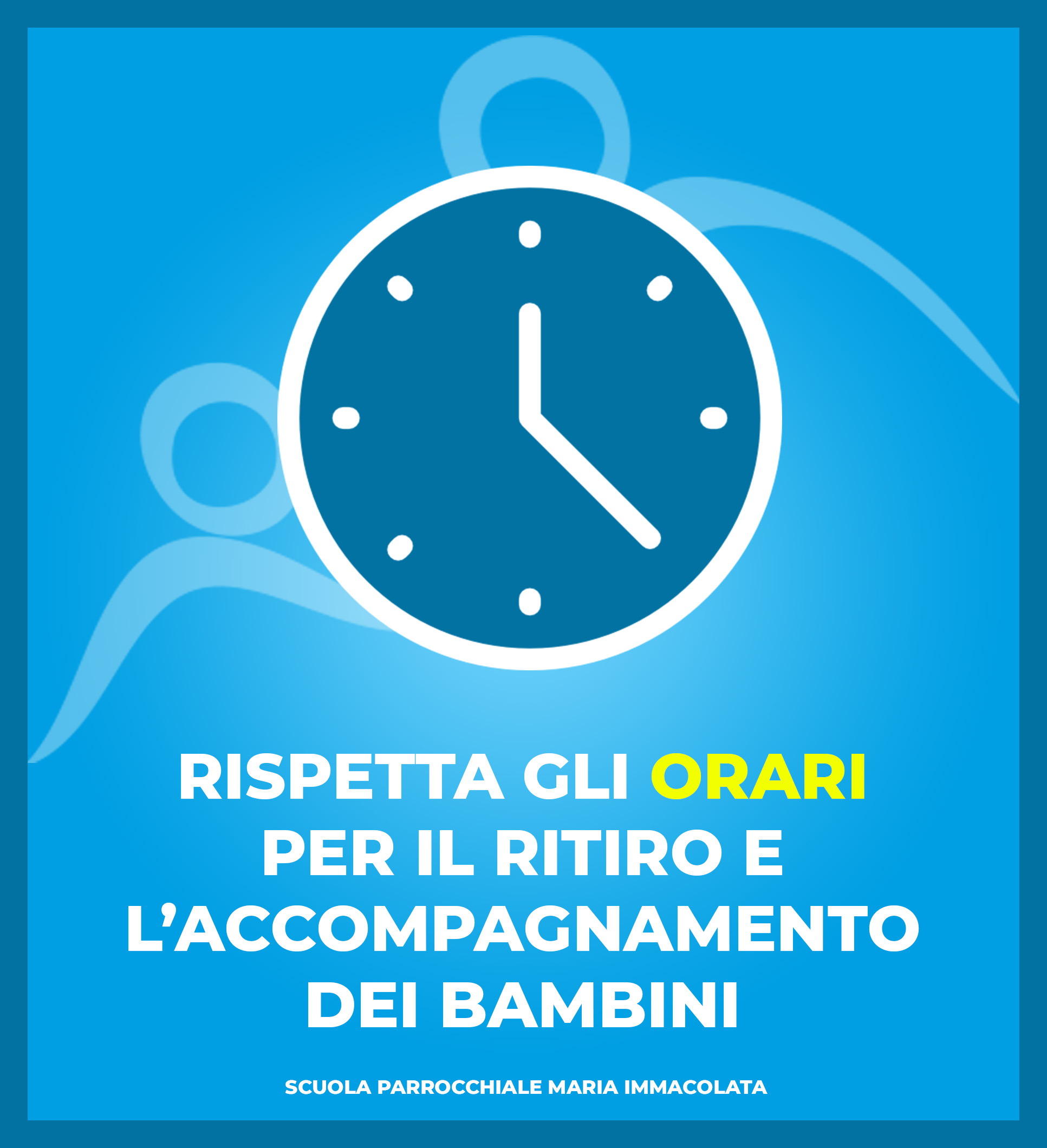 Raccomandiamo a tutti i genitori di rispettare scrupolosamente gli orari pensati per le varie sezioni. Sarà consentito l’accesso a scuola ad un solo genitore per bambino, previo il rispetto del Protocollo sicurezza.