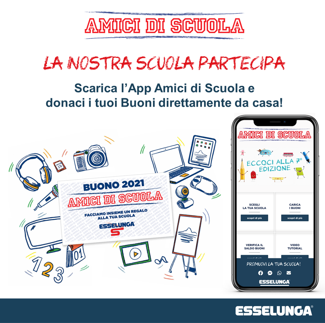 Fino al 17 novembre, i clienti di Esselunga riceveranno, a seconda della spesa effettuata, i Buoni Scuola e potranno consegnarli a scuola (presso la portineria) oppure, in alternativa, donarli direttamente da casa tramite l’App Amici di Scuola disponibile gratuitamente su Google Play e App Store. I buoni vanno consegnati in segreteria o preferibilmente nel contenitore presente in portineria.
