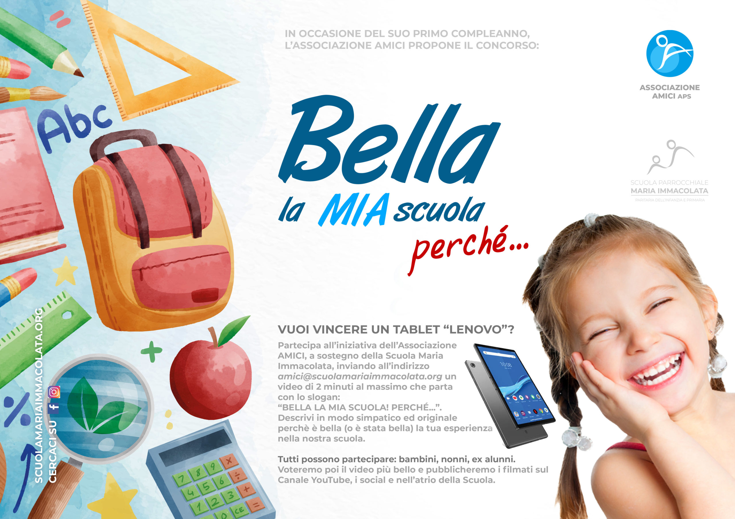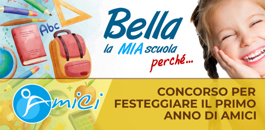 In occasione del primo compleanno dell’Associazione a sostegno della scuola AMICI Aps, nata il 31 gennaio 2021, è stato proposto il concorso: “Bella la mia scuola perchè…". Invia all’indirizzo amici@scuolamariaimmacolata.org un video di 2 minuti al massimo che parta con lo slogan: “BELLA LA MIA SCUOLA! PERCHÉ…”. Descrivi in modo simpatico ed originale perchè è bella (o è stata bella) la tua esperienza nella nostra scuola. Tutti possono partecipare: bambini, nonni, ex alunni.