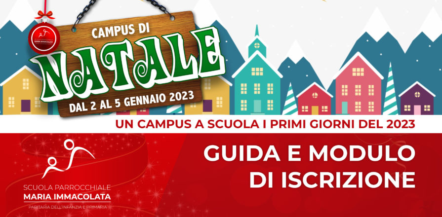 Da martedì 8 fino a martedì 6 dicembre 2022 sono aperte le iscrizioni al Campus di Natale dal 2 al 5 gennaio 2023. L’esperienza, rivolta a tutti i bambini (anche non iscritti alla Scuola Maria Immacolata) dai 3 ai 10 anni, sarà coordinata dal personale educativo della scuola nella fascia oraria dalle 7.45 alle 16.15 (con possibilità di iscrizione al post scuola fino alle 18.30 al raggiungimento del numero minimo di iscritti). Per partecipare occorre consegnare in segreteria il modulo di iscrizione (disponibile nell’atrio della scuola o scaricabile da questa pagina) e versare la quota di iscrizione.