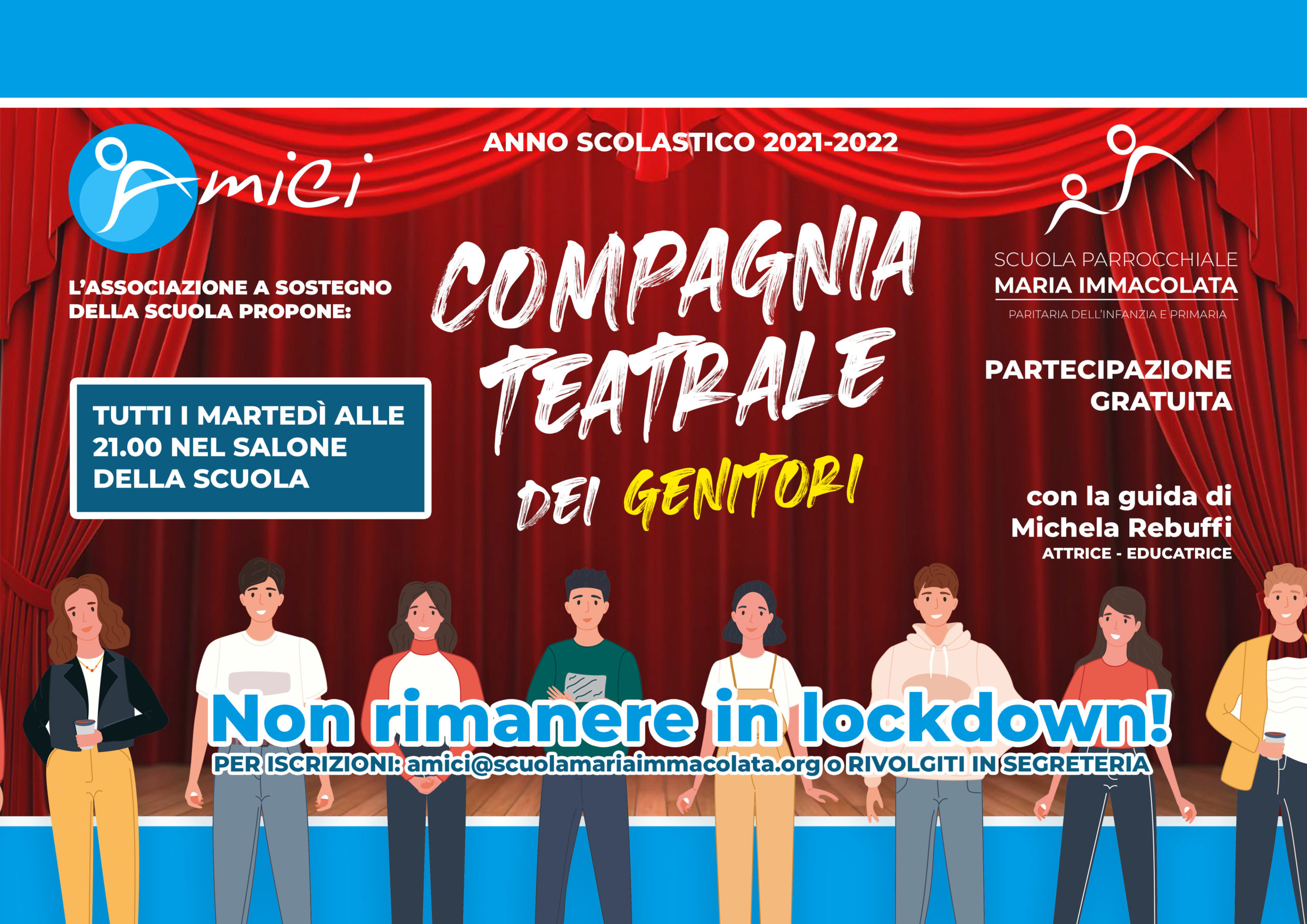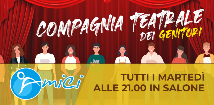Tutti i martedì alle 21.00, nel salone teatro della scuola, ti aspetta la compagnia teatrale dei genitori! Guidato da Michela Rebuffi (attrice, educatrice e operatrice di teatroterapia) il gruppo vuole essere una occasione per stare insieme, divertirsi e proporre qualcosa di bello e simpatico a servizio della scuola. L’iscrizione e la partecipazione è gratuita.