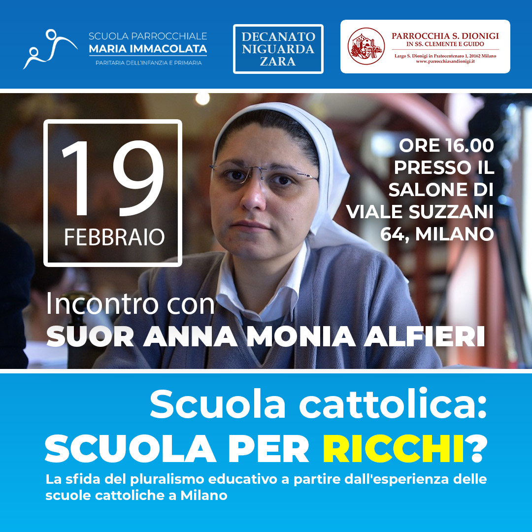 Domenica 19 febbraio alle 16.00, nel corso dell’incontro “Scuola cattolica: scuola per ricchi?” affronteremo il tema del diritto alla libertà di scelta educativa, messo a dura prova dalla condizione di ingiustizia sociale a cui le scuole paritarie sono sottoposte. Presente all’incontro, oltre a Suor Anna Monia Alfieri, anche il Decano di Niguarda – Zara, padre Luca Zanchi e la coordinatrice didattica della Scuola parrocchiale Luigi Cislaghi, Lucia Rocco.