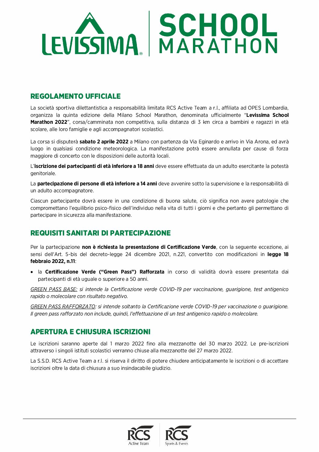 L'Associazione a sostegno della scuola AMICI invita a partecipare tutti gli alunni della scuola Primaria con le loro famiglie alla Levissima School Marathon, una corsa non competitiva sulla distanza di circa 3 km organizzata da RCS Sports & Events, SSD RCS Active Team e OPES (Organizzazione per l’educazione allo sport) sabato 2 aprile 2022 alle 9.00 a City Life. Possono partecipare tutti gli studenti della Scuola Primaria e i loro accompagnatori: insegnanti, genitori, familiari. L’ultima edizione, che si è svolta nell’aprile 2019, ha visto un serpentone festoso di oltre 13.000 bambini e accompagnatori colorare per oltre 4 ore le strade del Parco di City Life e il Marathon Village.
