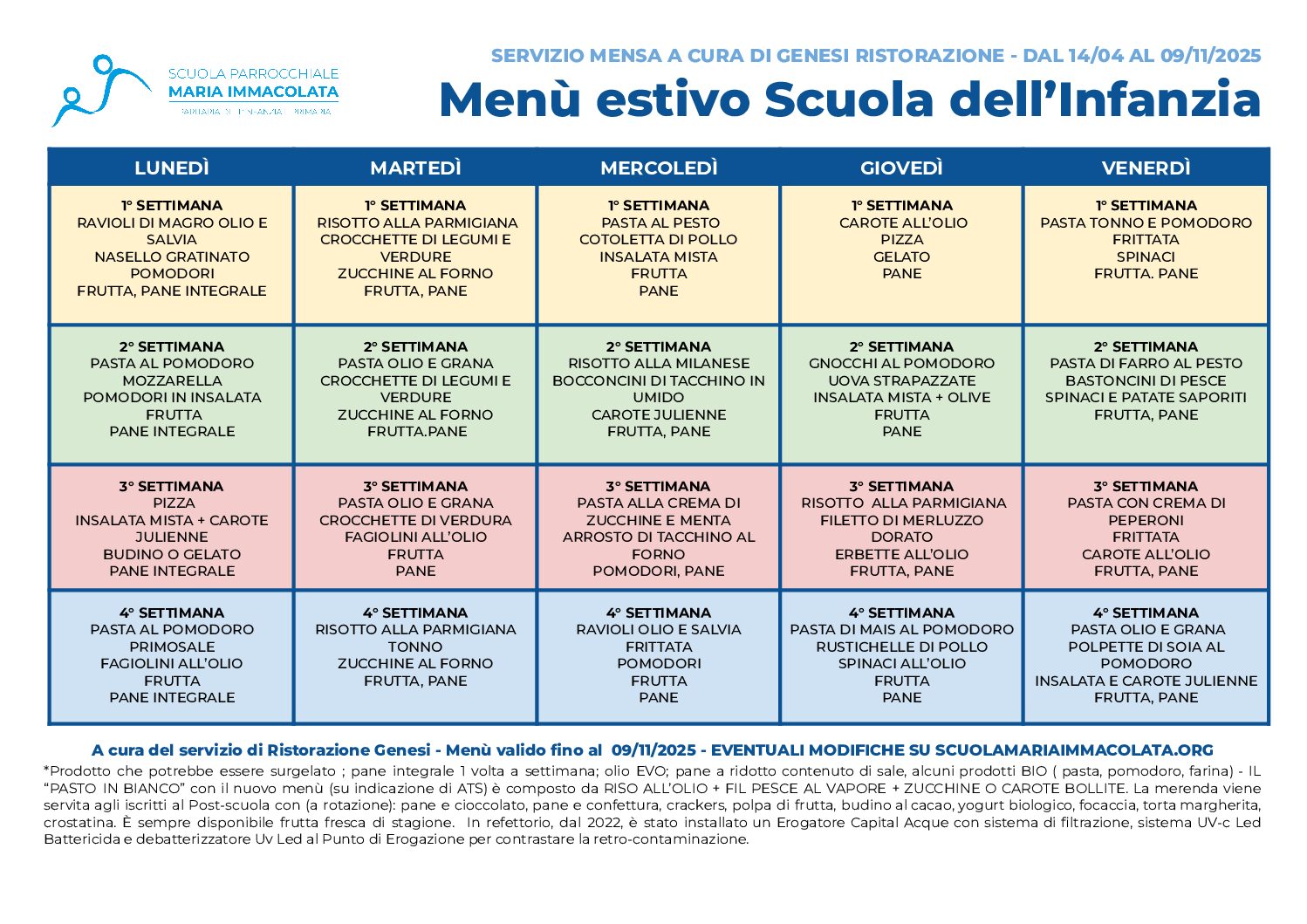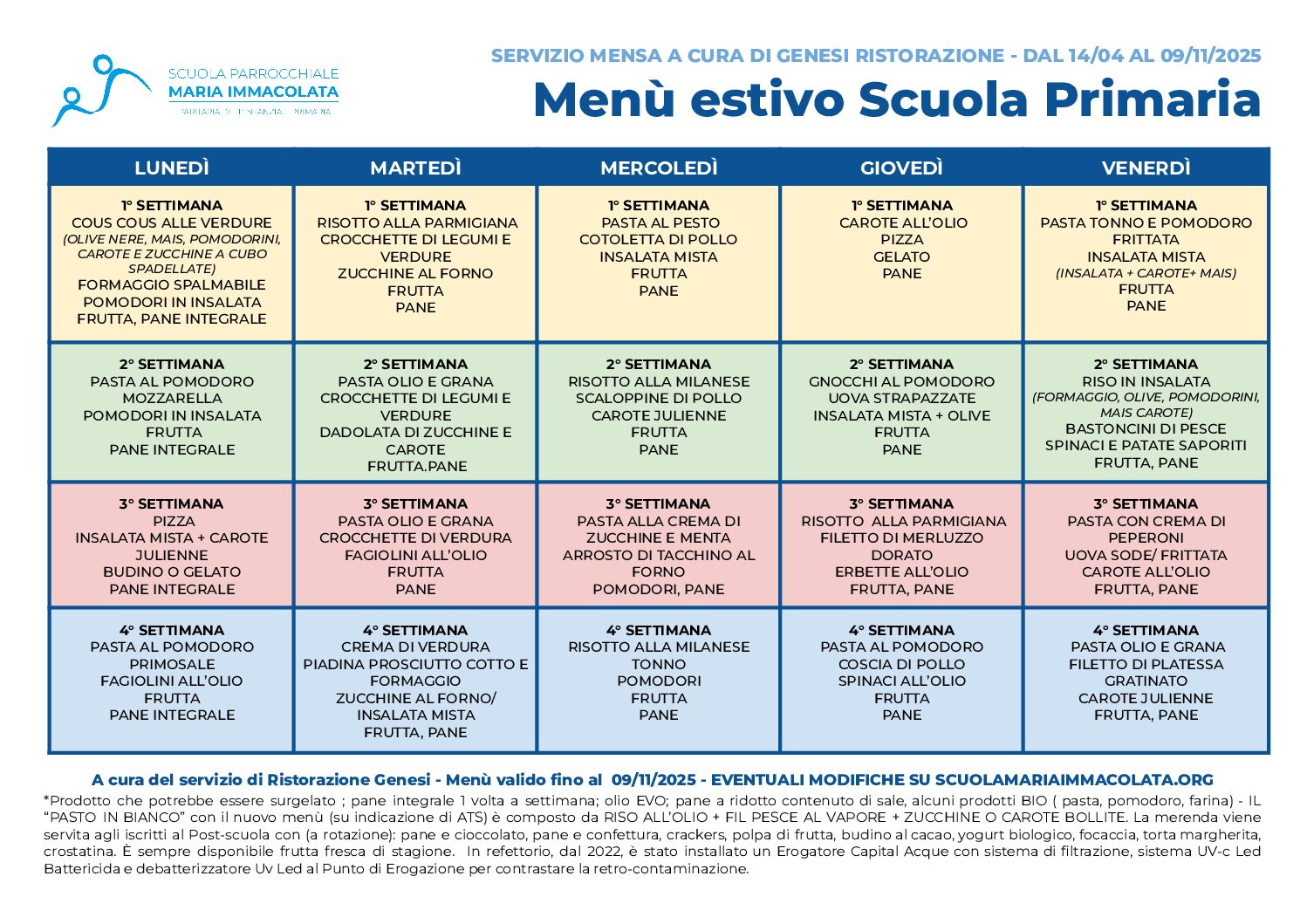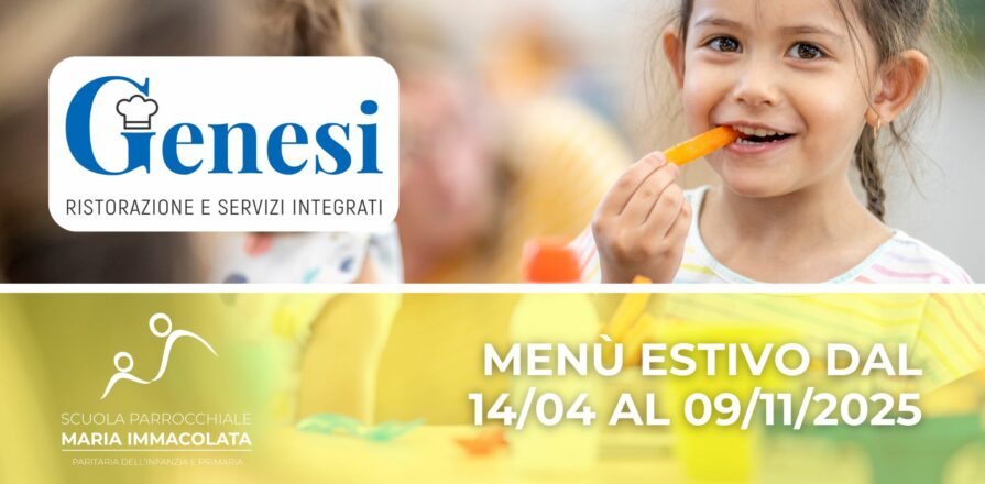 Ecco il menù estivo, in vigore da lunedì 14 aprile 2025, per il servizio mensa gestito dal Gruppo Genesi Ristorazione. All’interno del menù sono riportate anche le proposte per la merenda. Il menù prenderà il via dalla terza settimana.