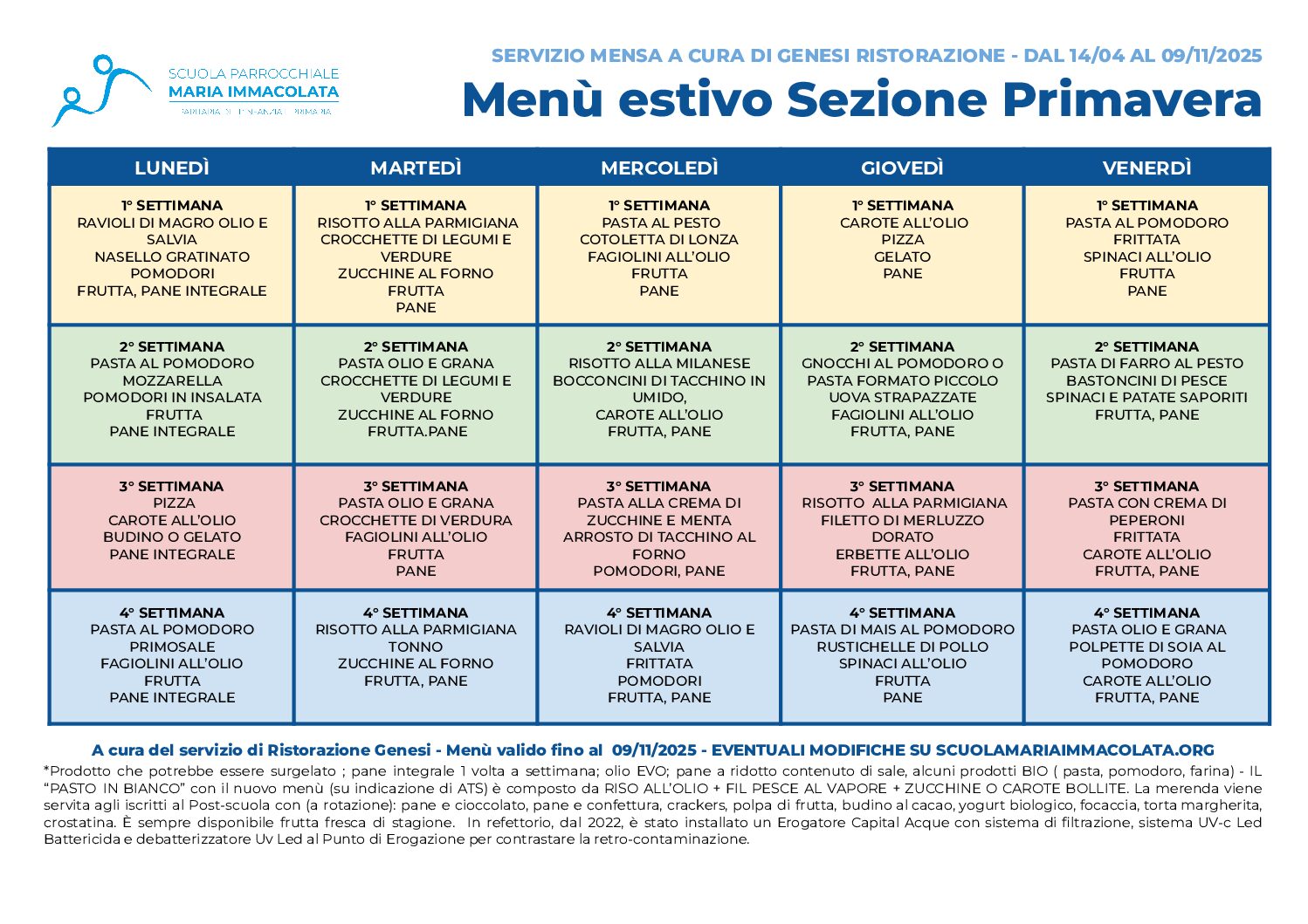 Menù del servizio mensa dal 14 aprile al 9 novembre 2025