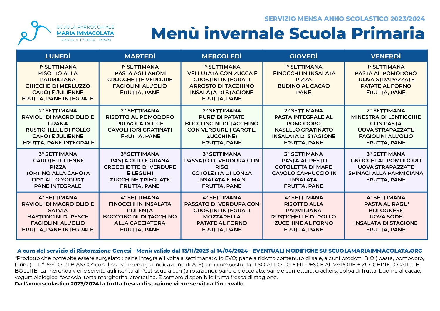Ecco il menù invernale, in vigore da lunedì 13 novembre 2023, per il servizio mensa gestito dal Gruppo Genesi Ristorazione. All'interno del menù sono riportate anche le proposte per la merenda. Dal mese di novembre, su indicazione di ATS ci sono due importanti novità: