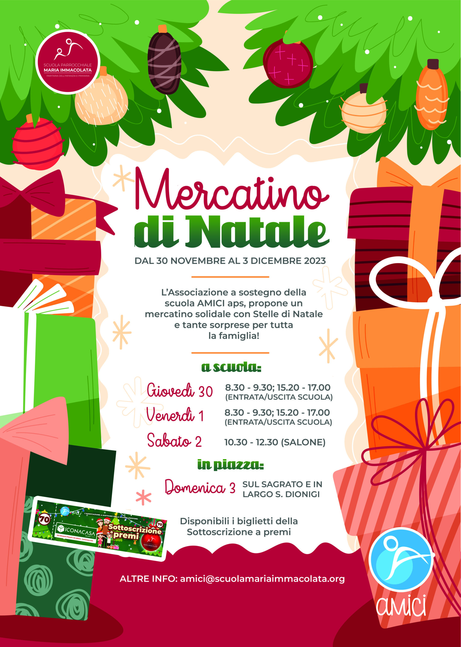 I volontari dell’Associazione AMICI Aps ti aspettano per il mercatino di Natale dal 30 Novembre al 3 Dicembre 2023. Quest’anno trovi le “Stelle di Natale" e tante sorprese per tutta la famiglia. Presso il banchetto dell’Associazione saranno disponibili anche i biglietti della Sottoscrizione a premi di Natale (Estrazioni il giorno della Cena di Natale, venerdì 15 Dicembre). Per informazioni scrivi a amici@scuolamariaimmacolata.org.