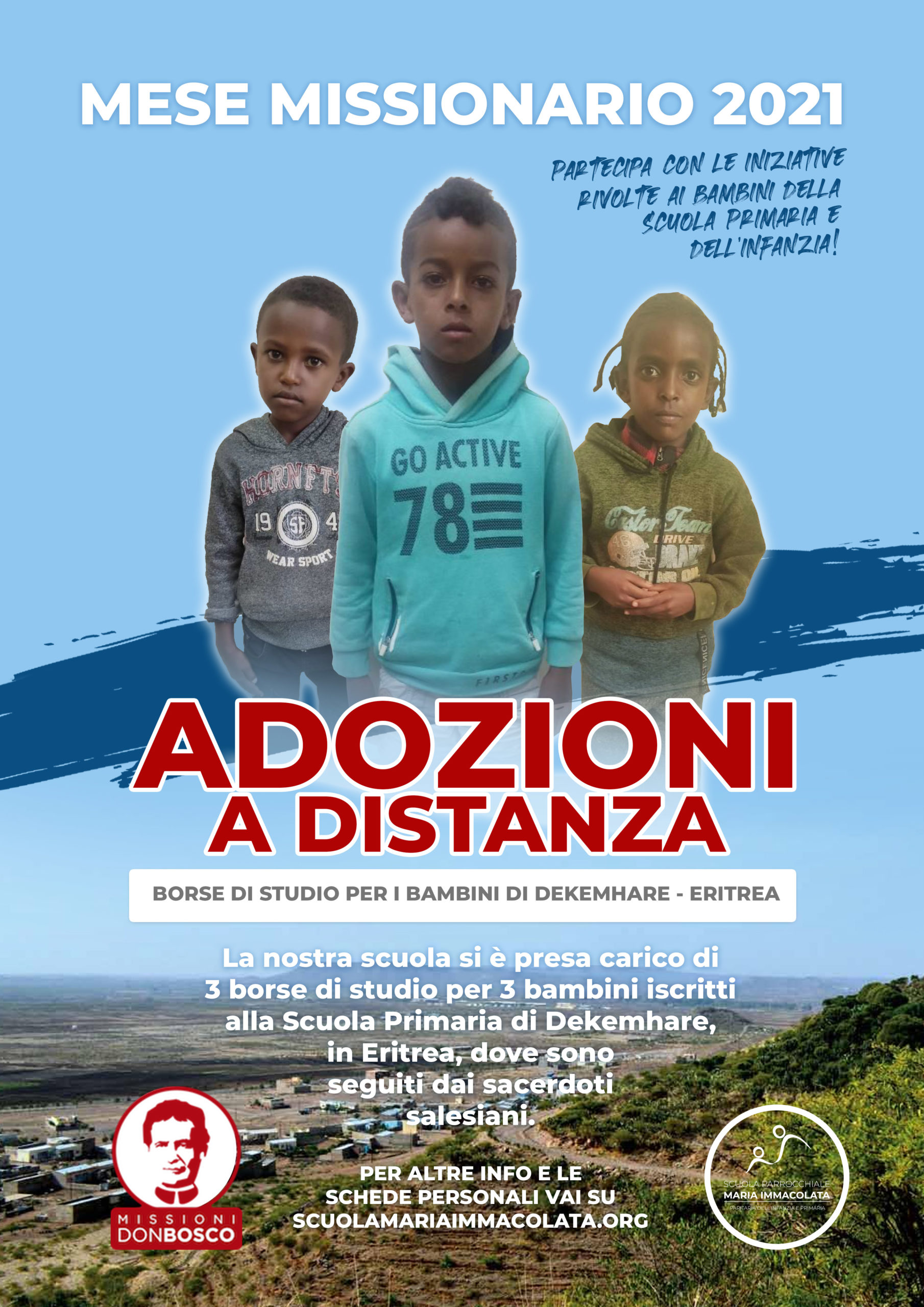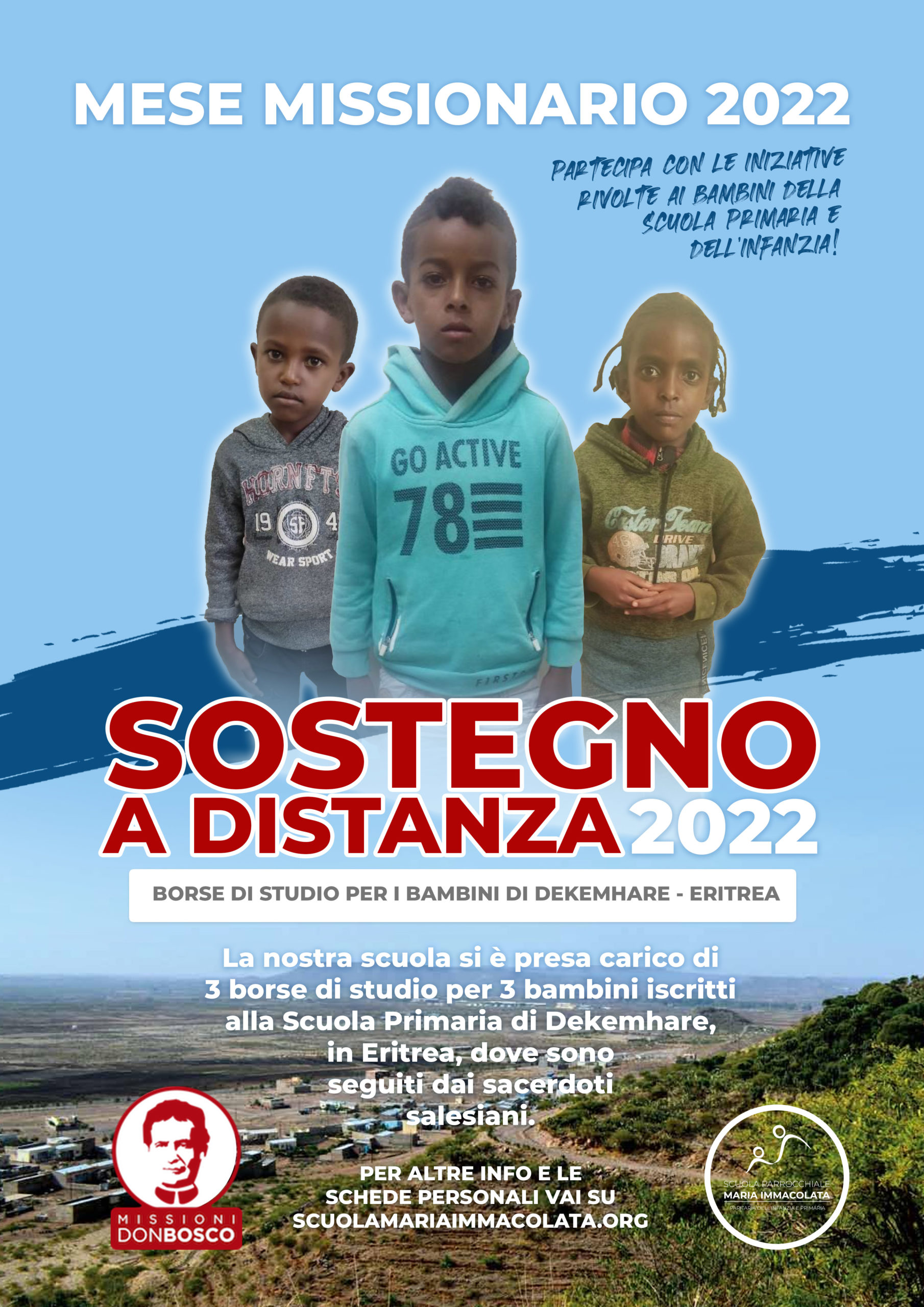 La nostra scuola si è impegnata a sostenere per tre anni con 3 borse di studio il percorso scolastico di 3 bambini di Dekemhare, in Eritrea: Martha, Temesgen e Aman. Il sostegno a distanza è partito lo scorso anno, quindi si tratta del secondo anno di collaborazione.