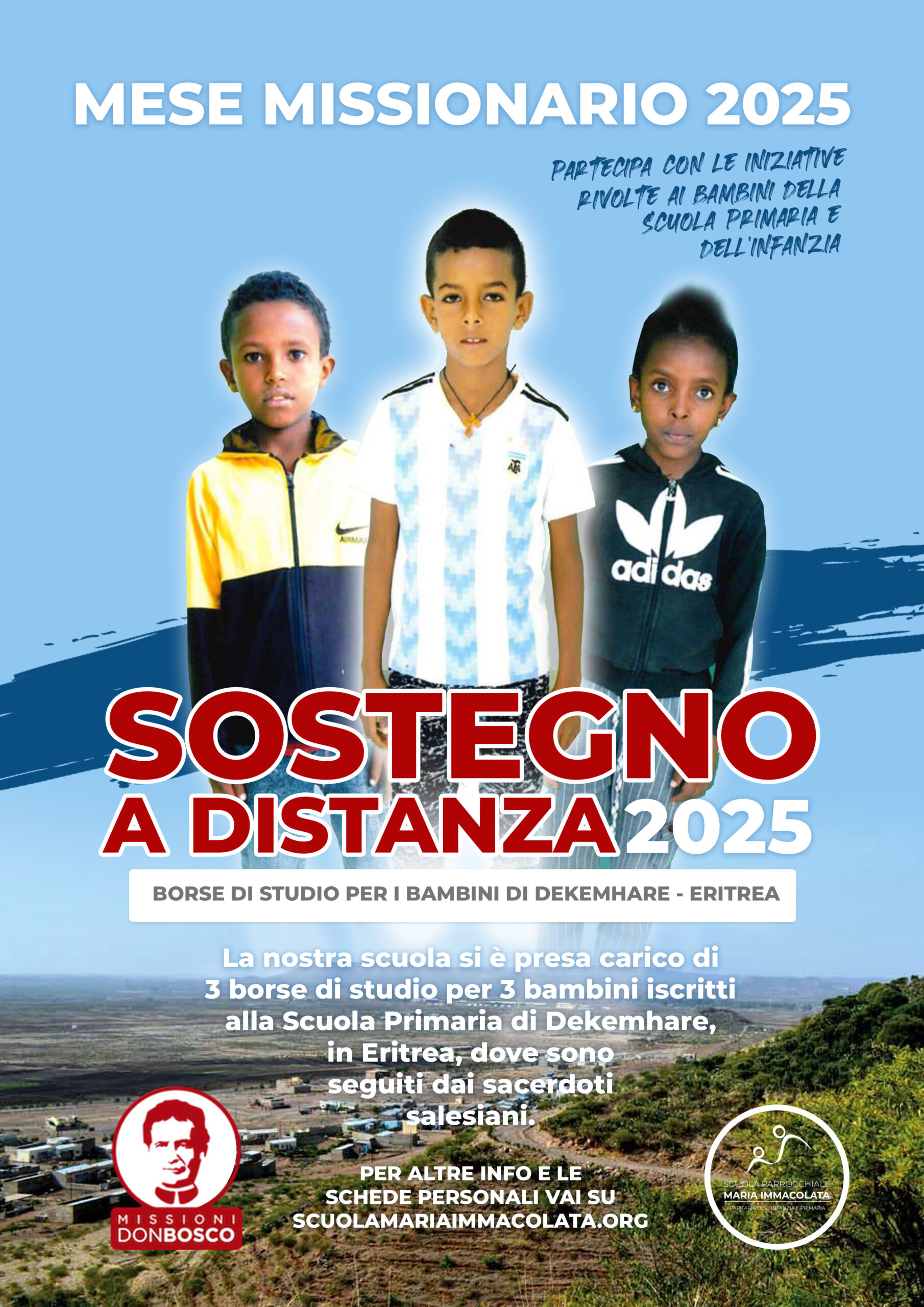 La nostra scuola si è impegnata a sostenere con 3 borse di studio il percorso scolastico di 3 bambini di Dekemhare, in Eritrea: Martha, Temesgen e Aman. Il sostegno a distanza è partito nell'anno scolastico 2021/2022, quindi si tratta del quinto anno di collaborazione.