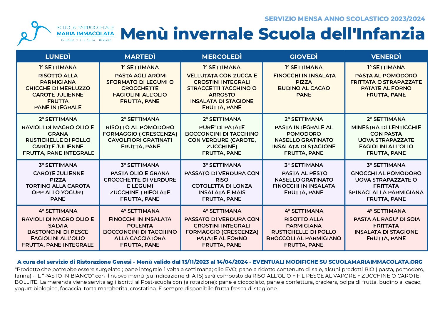 - Mercoledì 13 febbraio 2024 proporremo pasta olio e grana, provola e carote julienne.