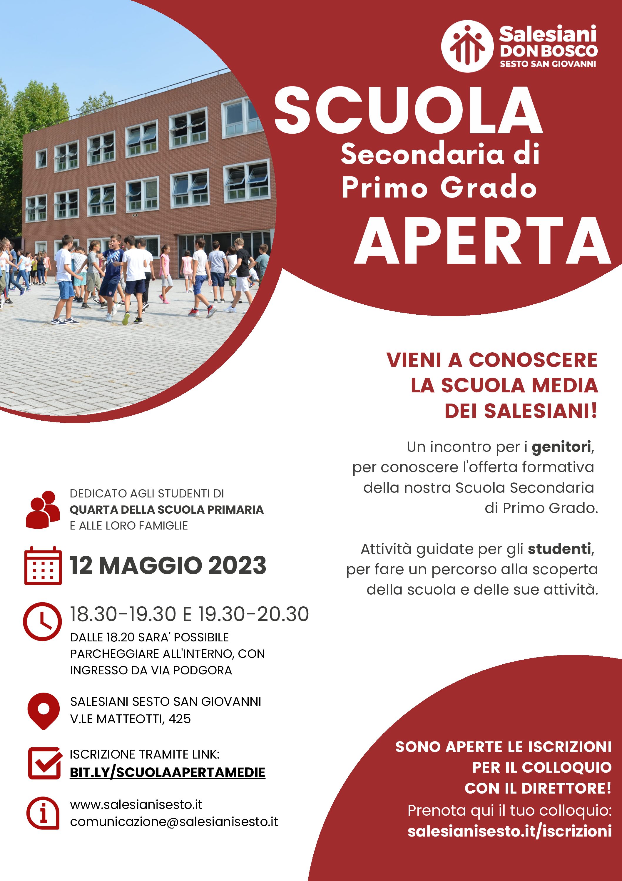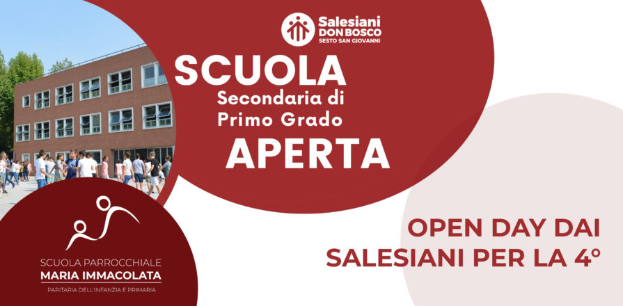 Per dare la possibilità alle famiglie dei ragazzi che attualmente frequentano la classe quarta della scuola primaria di approfondire la conoscenza dell’offerta educativa e didattica della Scuola Secondaria di primo grado (scuola media) dei Salesiani di Sesto San Giovanni, l’istituto ha organizzato un momento di SCUOLA APERTA il 12 MAGGIO 2023 dalle ore 18.30 alle ore 19.30 oppure dalle 19.30 alle 20.30.