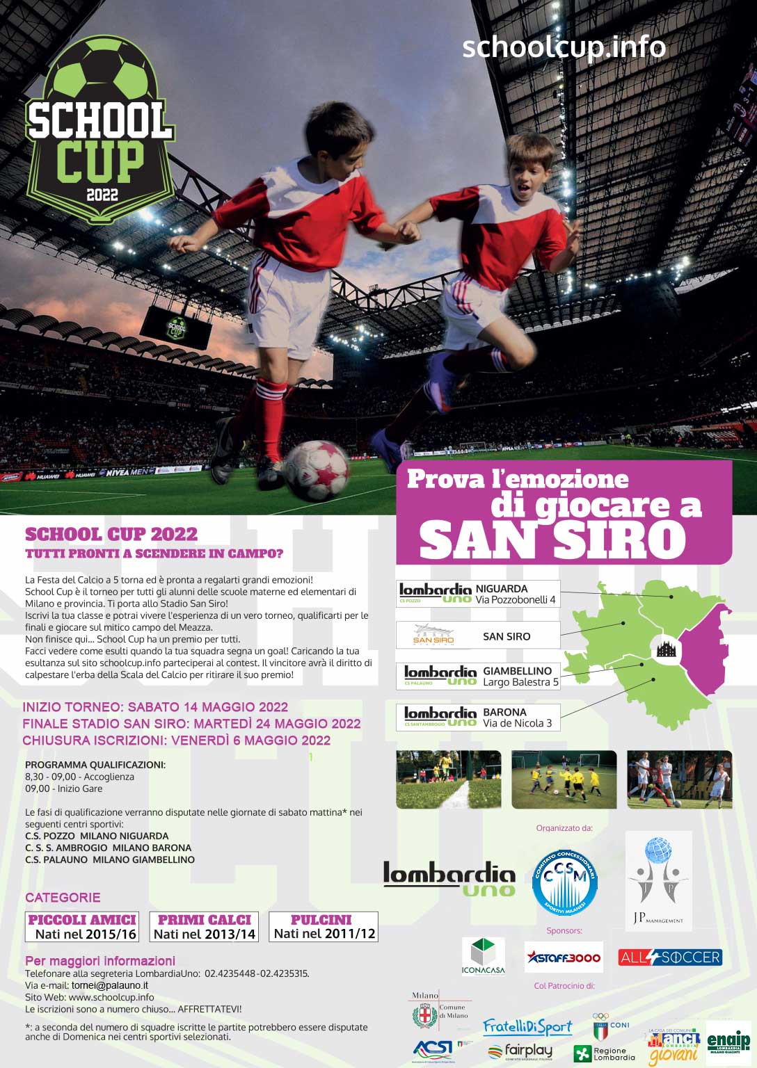 Le fasi eliminatorie della manifestazione verranno disputate nei centri sportivi del gruppo LombardiaUno, mentre le finali sul mitico Stadio San Siro. L’evento è organizzato da Lombardia Uno, struttura dall’esperienza trentennale nella formazione dei giovani calciatori, partner AC Milan nell’ambito del Progetto Giovani in qualità di Centro Tecnico, Scuola Calcio Milan e Milan Junior Camp.