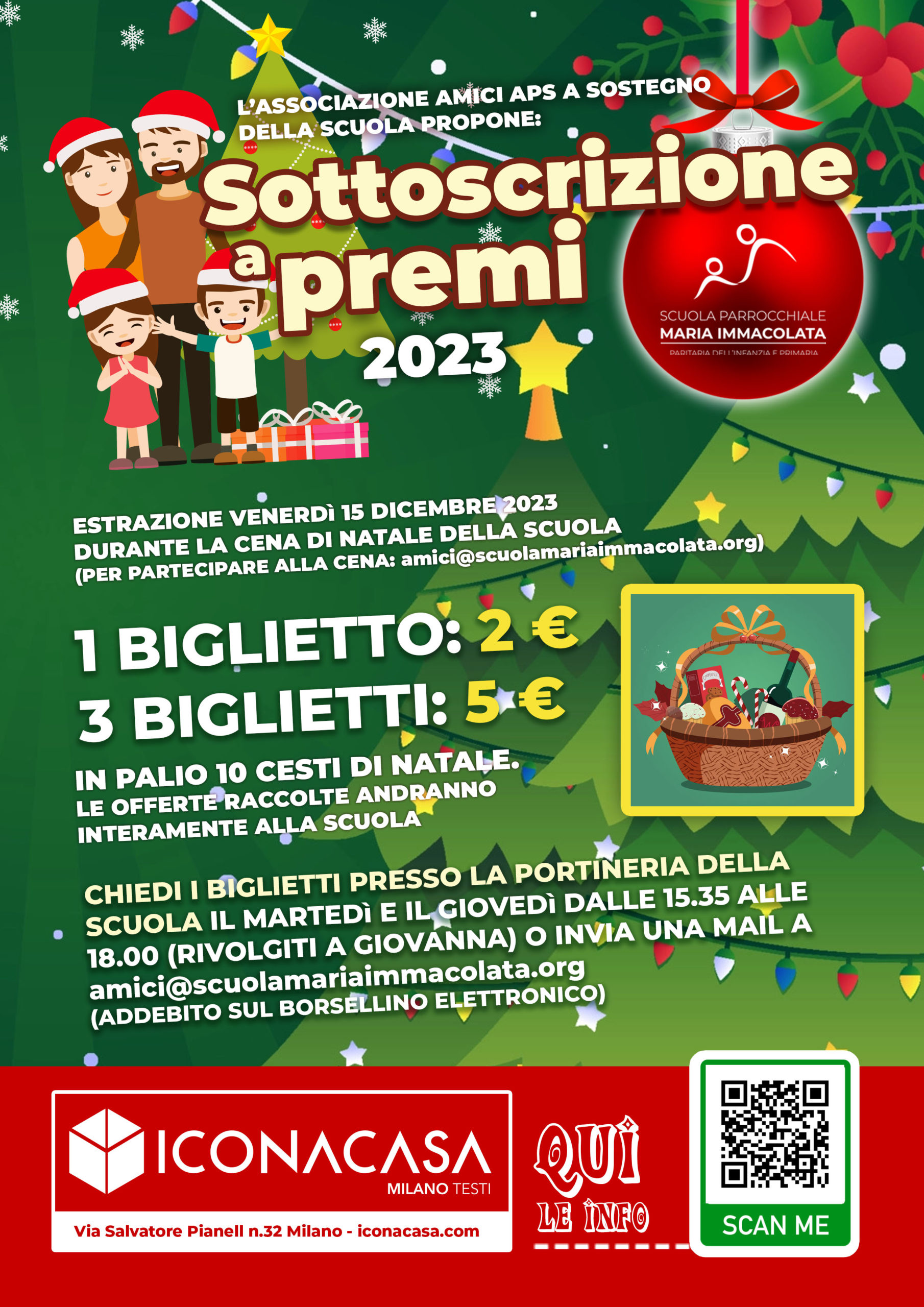 L’estrazione della Sottoscrizione a premi sarà venerdì 15 dicembre 2023, in occasione della cena di Natale nel refettorio e nel teatro della scuola.
