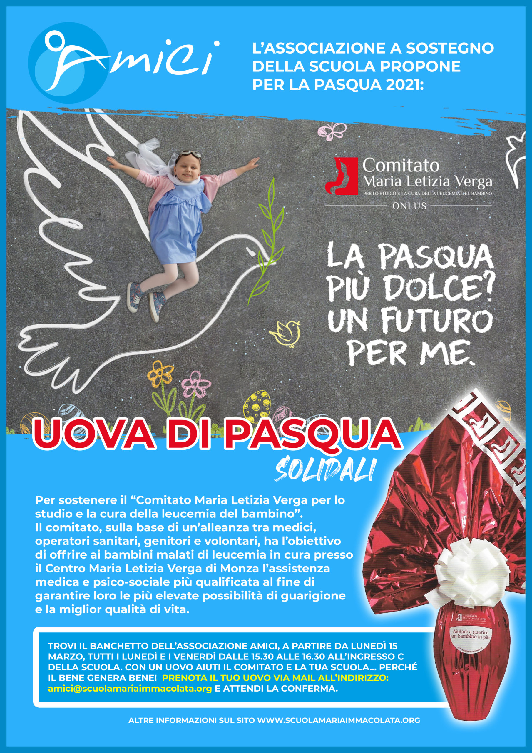 A partire da lunedì 15 marzo, tutti i lunedì e venerdì dalle 15.30 alle 16.30 troverai un banchetto dell’Associazione presso l’ingresso C con uova di pasqua solidali del Comitato Maria Letizia Verga, acquistati dalla scuola. Puoi prenotare da subito una o più uova mandando una mail a amici@scuolamariaimmacolata.org.