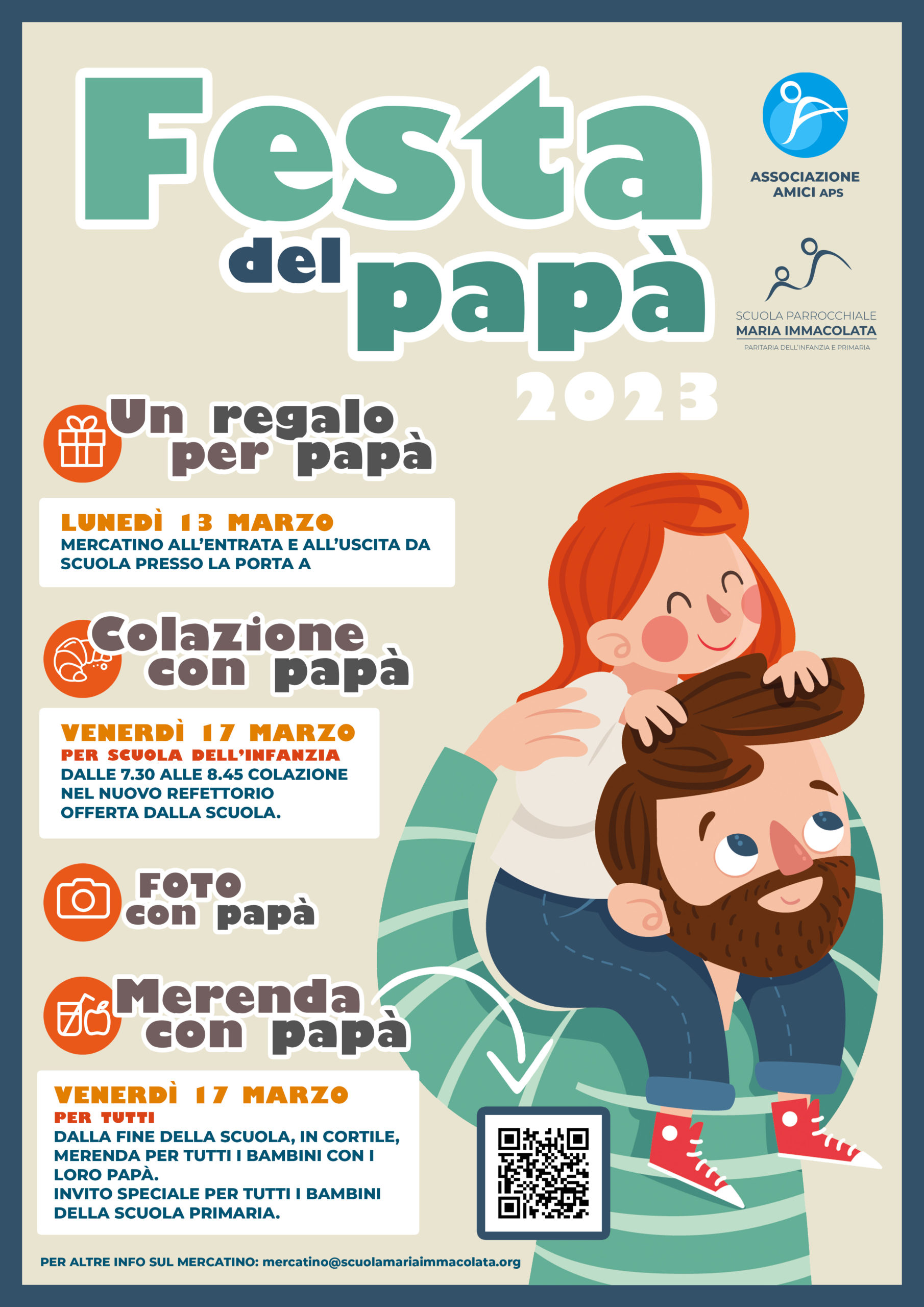 Per fare un bel regalo a papà ed aiutare la scuola, i volontari dell’Associazione AMICI propongono per lunedì 13 marzo un mercatino all’ingresso e all’uscita da scuola. Ricordiamo che per le donazioni a favore del mercatino è disponibile anche l’account Satispay. Per altre info: mercatino@scuolamariaimmacolata.org.