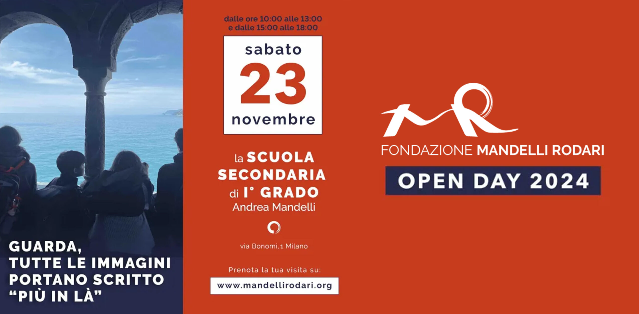 Venerdì 2 Dicembre si terrà l'ultima giornata di Open Day in vista dell'anno scolastico 2023-2024. Dopo la grande affluenza delle giornate di ottobre e novembre, sono rimasti pochissimi posti per conoscere la nostra scuola e visitare i suoi spazi. QUI il modulo per la richiesta (ATTENDERE CONFERMA TELEFONICA O VIA MAIL). Nella giornata di venerdì sono stati creati gruppi da tre/quattro famiglie ogni ora (dalle 9.00 alle 18.00) che visiteranno la struttura accompagnati dagli alunni e dal personale scolastico.